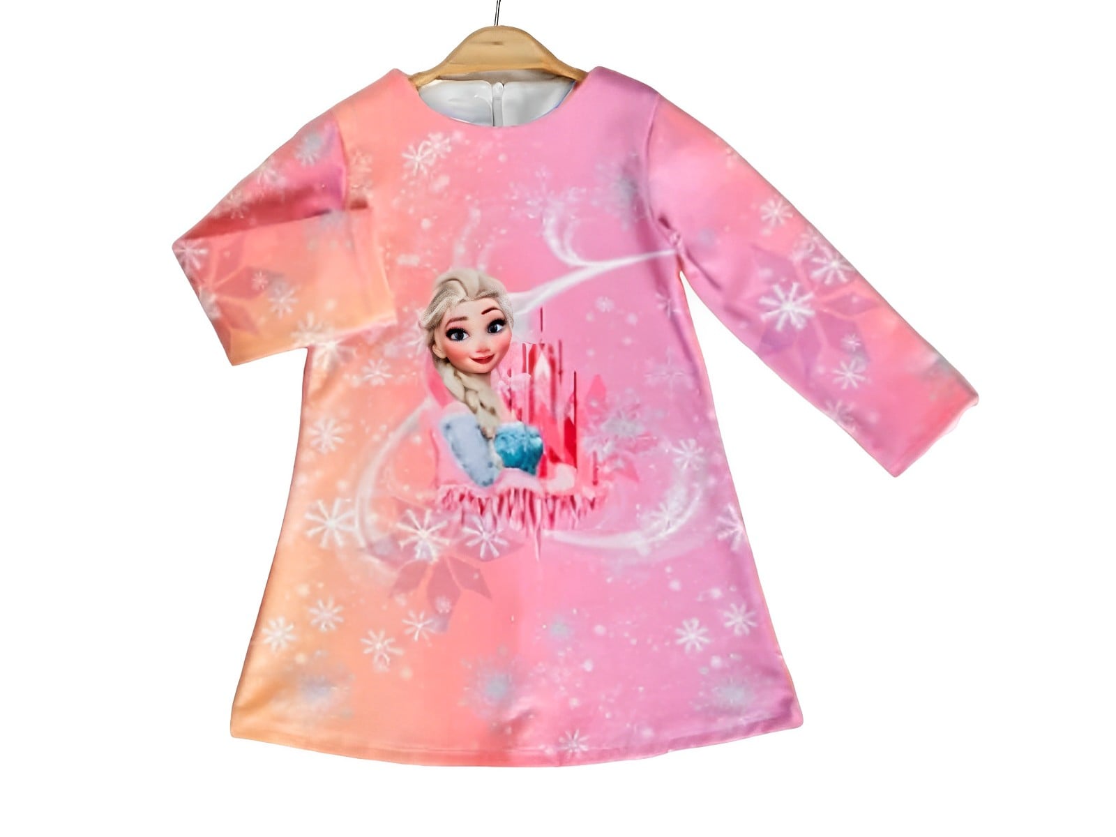 Βρεφικό φορεματάκι μακρυμάνικο σε ροζ χρώμα με σχέδιο στάμπα ηρωίδα κινουμένων σχεδίων. Στο πίσω μέρος του το φόρεμα έχει άνοιγμα με φερμουάρ.