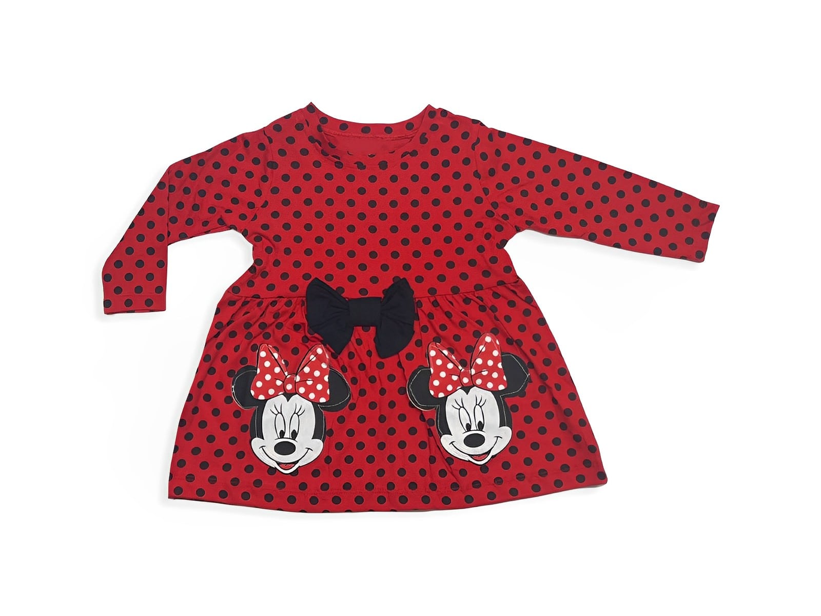 Φορεματάκι μακρυμάνικο σε πουά κόκκινο χρώμα χρώμα με σχέδιο στάμπα ήρωα κινουμένων σχεδίων. Στο κέντρο του το φόρεμα διαθέτει μαύρο μεγάλο φιόγκο.