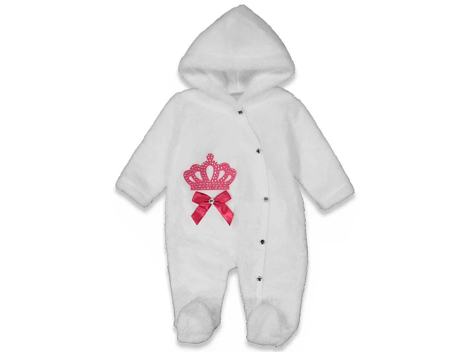 Φορμάκι με κουκούλα από ενισχυμένο fleece (φλις) σε άσπρο χρώμα με σχέδιο απλικέ κορόνα και κολλημένο φιόγκο σε φουξ χρώμα. Το φορμάκι έχει άνοιγμα με τρουκς (κόπιτσες) για μεγαλύτερη ευκολία και στο τελείωμά του έχει κλειστά ποδαράκια.