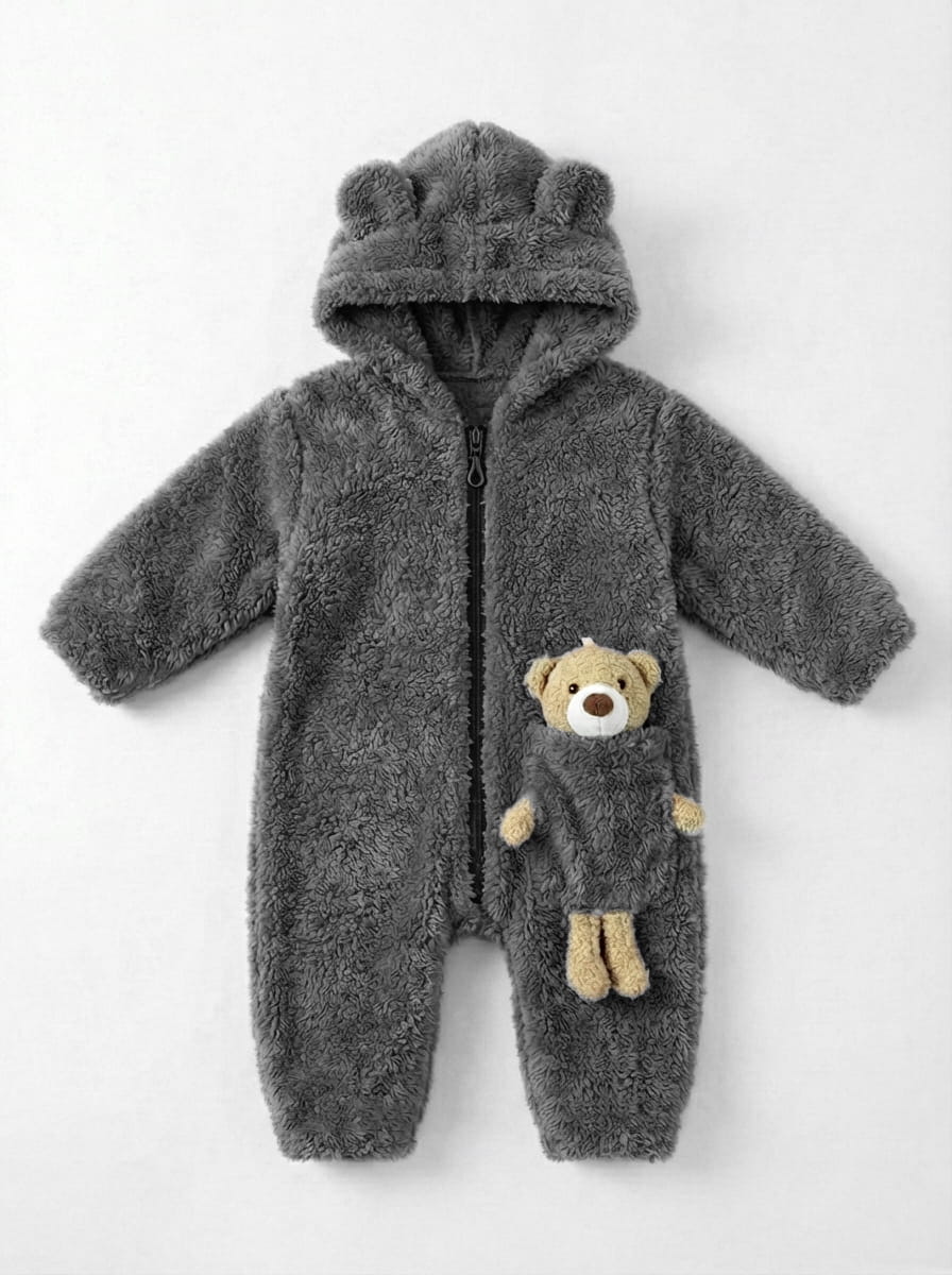 🧸 Σχεδιασμός: Ολόσωμο φορμάκι σε ανθρακί χρώμα, που διαθέτει μια πρωτότυπη μπροστινή τσέπη η οποία φιλοξενεί ένα μικρό, χαριτωμένο αποσπώμενο λούτρινο αρκουδάκι.