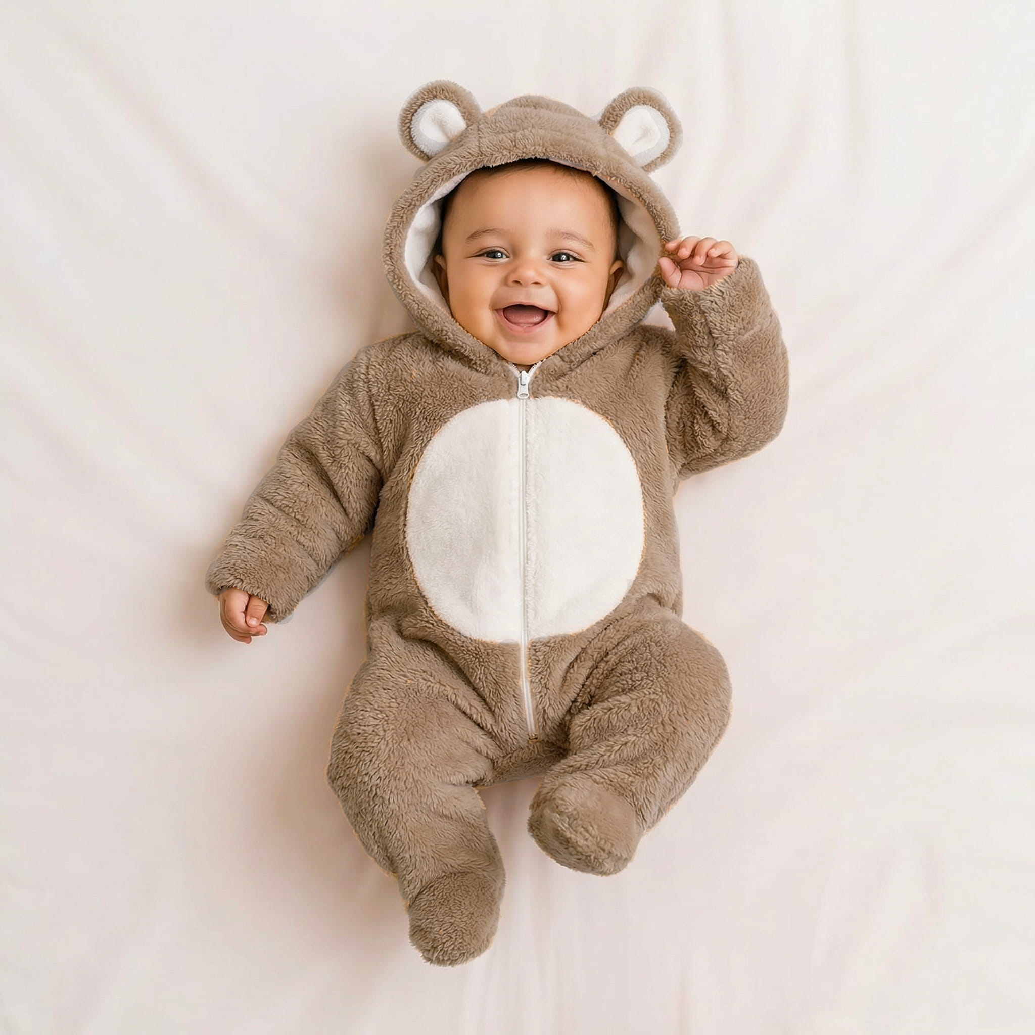 Βρεφικό Φορμάκι Fleece με Σχέδιο Αρκουδάκι και Ενιαία Κουκούλα – Ανοιχτό Καφέ (112481)