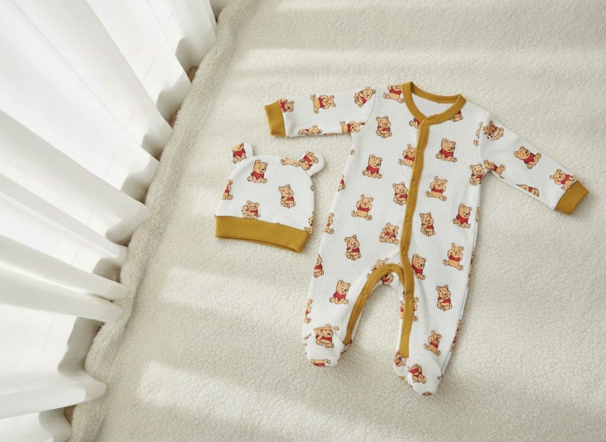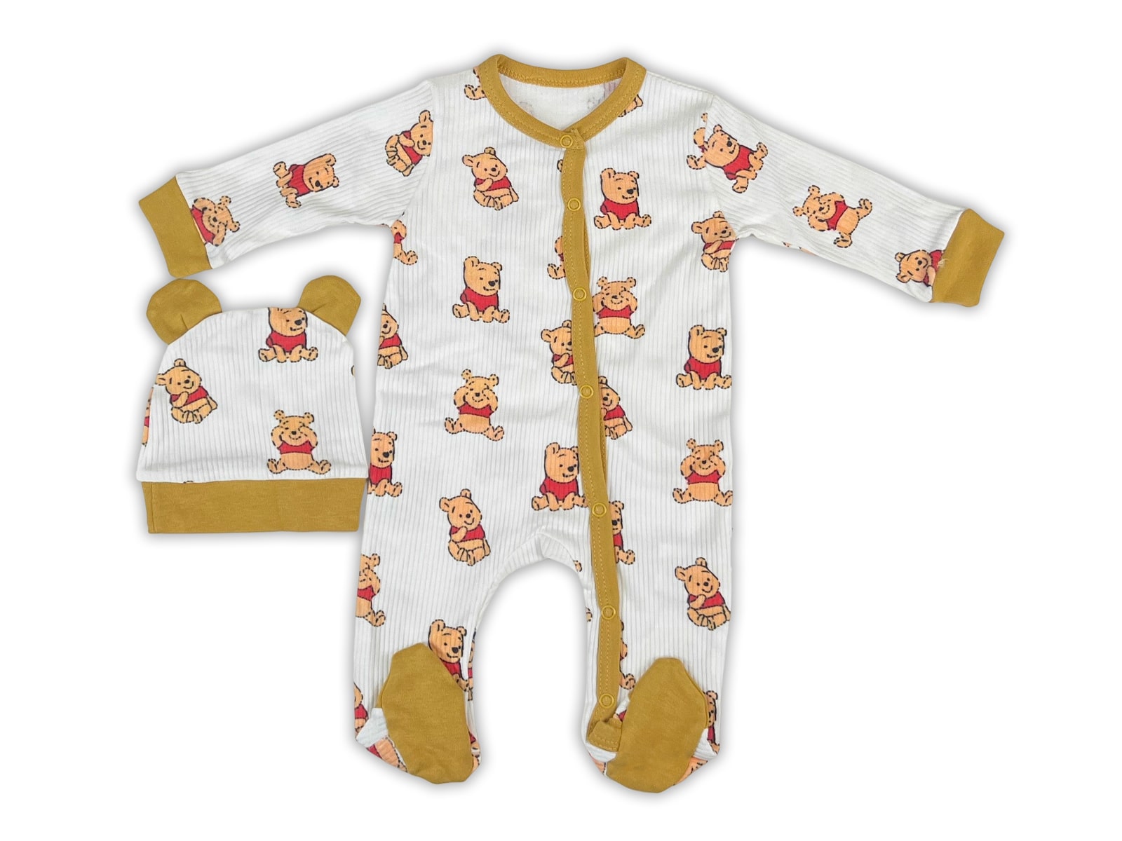 Φορμάκι με σχέδιο στάμπα το αγαπημένο αρκουδάκι κινουμένων σχεδίων των μικρών παιδιών. Είναι σε άσπρο χρώμα με κίτρινες λεπτομέριες, όπως ίδιο είναι και το σκουφάκι. Το φορμάκι έχει άνοιγμα με τρουκς και στο τελείωμά του έχει κλειστά ποδαράκια.