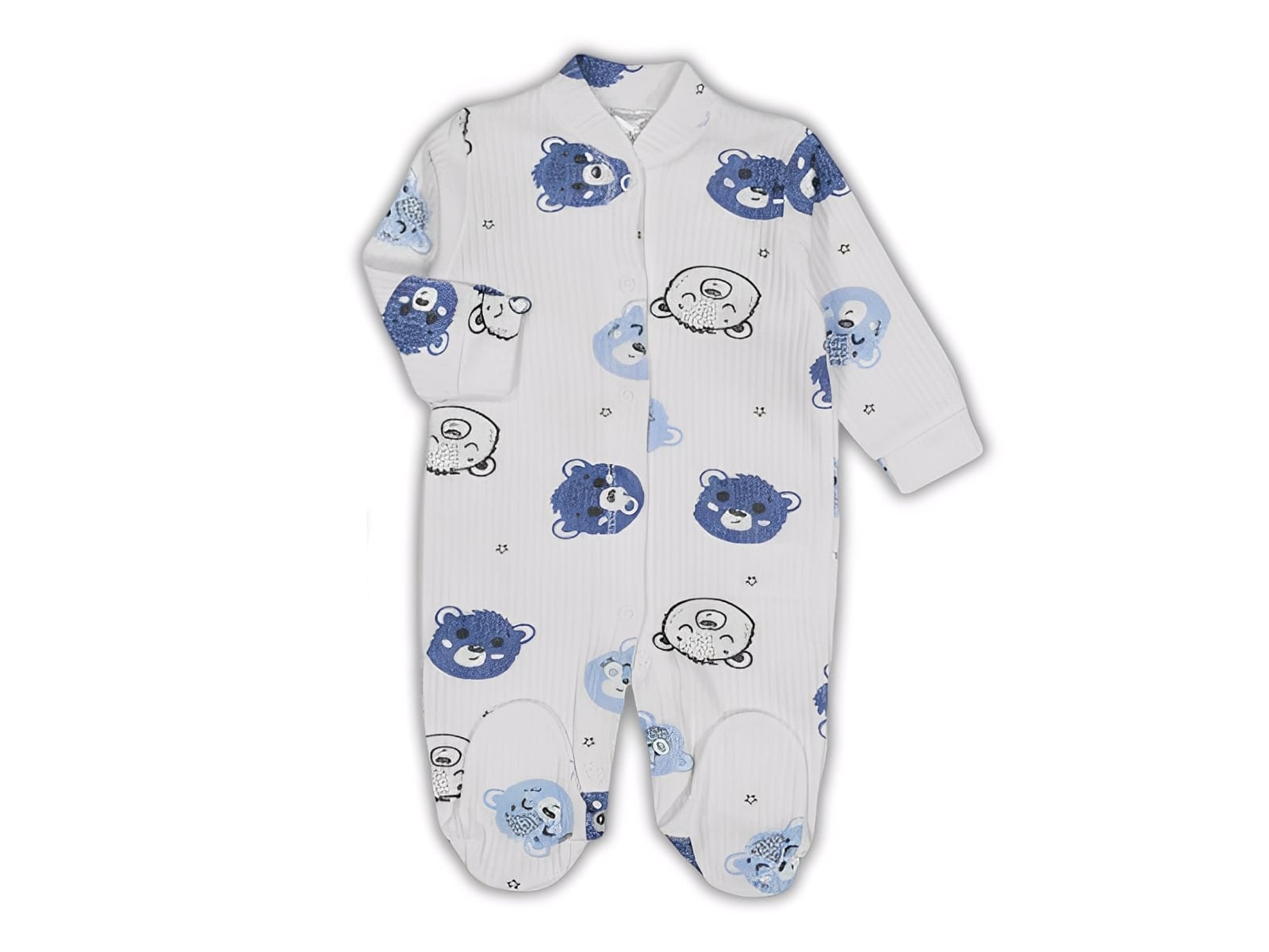 Φορμάκι μακρυμάνικο σε άσπρο χρώμα με στρογγυλή λαιμόκοψη το οποίο έχει σχέδιο μπλε αρκουδάκια. Στο τελείωμά του το φορμάκι έχει κλειστά ποδαράκια και άνοιγμα με τρουκς ( κόπιτσες ), για εύκολη αλλαγή πάνας.