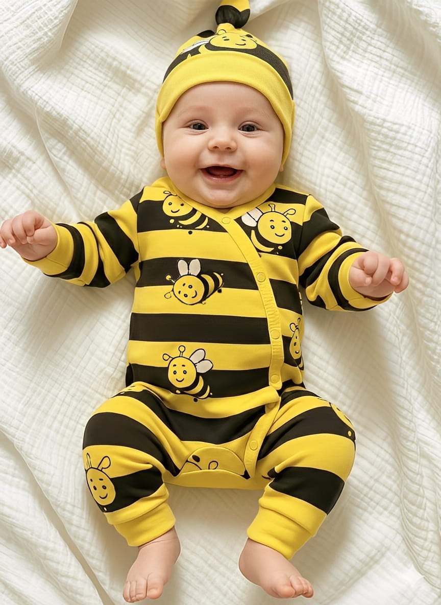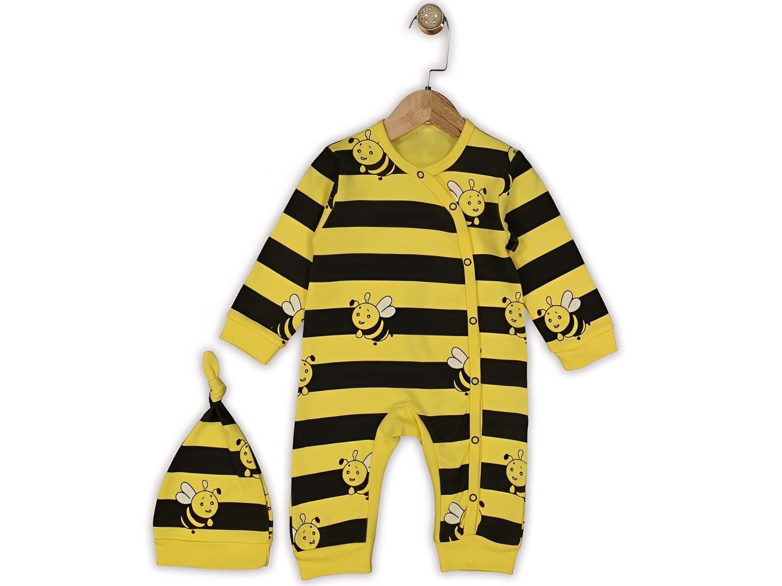 Φορμάκι και σκουφάκι με σχέδιο στάμπα ζωάκι μελισσούλα. Είναι σε κίτρινο – μαύρο χρώμα, όπως και το σκουφάκι. Το φορμάκι έχει άνοιγμα με τρουκς και στο τελείωμά του έχει κλειστά ποδαράκια.