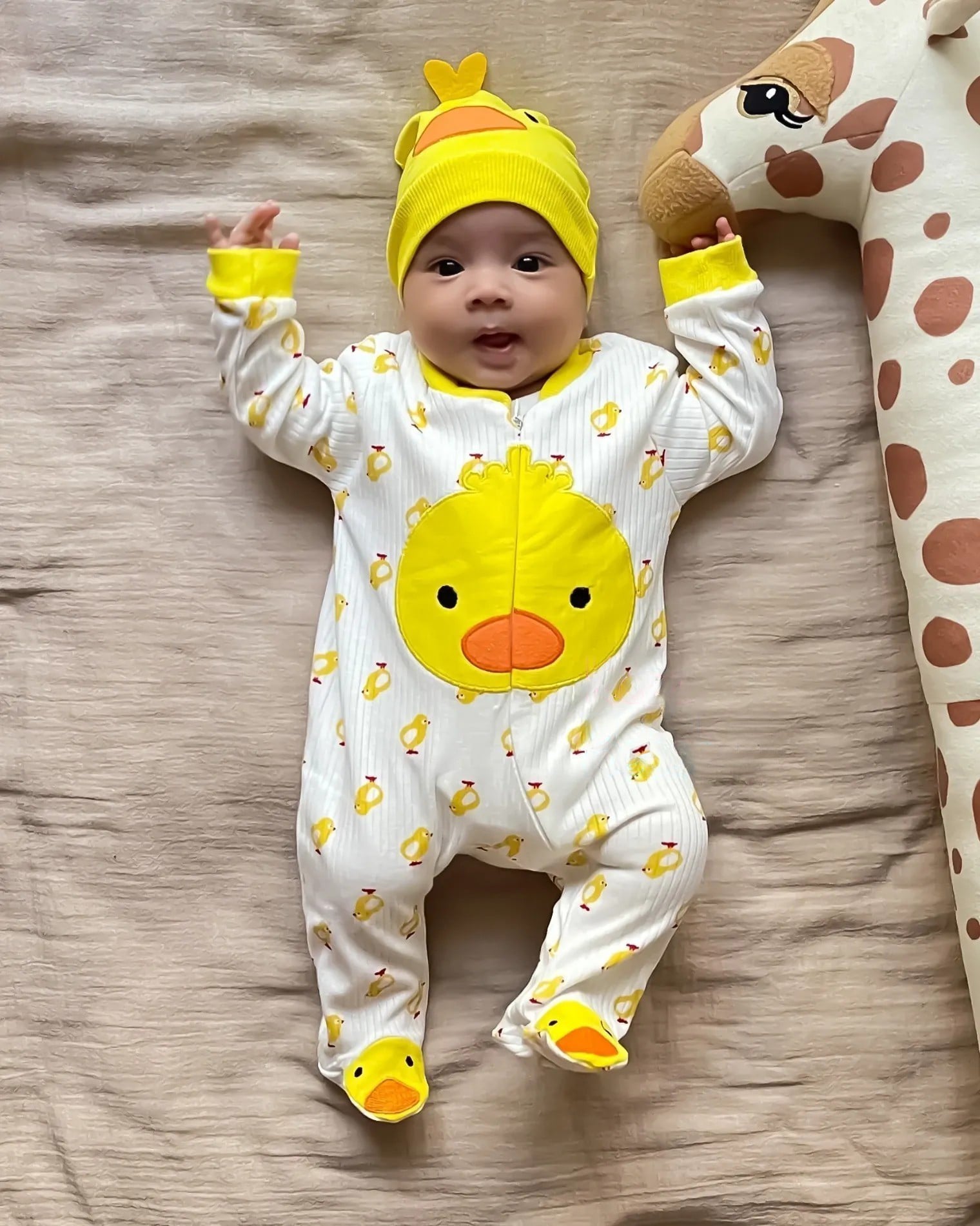 Φορμάκι με ανάγλυφο σχέδιο παπάκι. Το φορμάκι έχει άνοιγμα με φερμουάρ και στο τελείωμά του έχει κλειστά ποδαράκια. Το σκουφάκι είναι σε κίτρινο χρώμα με σχέδιο παπάκι.