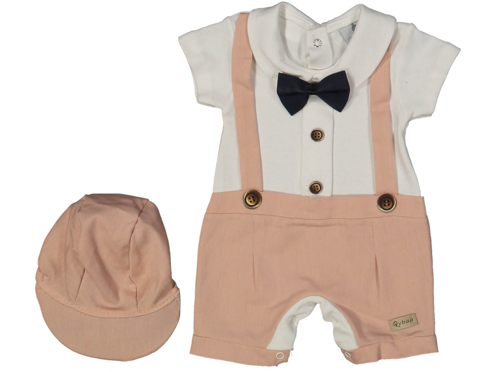 Φορμάκι κοντομάνικο σε σομόν χρώμα με σχέδιο μπλούζα με παντελονάκι με τιράντες, τα οποία είναι ενιαία και έχουν σχέδιο ραμμένα κουμπάκια. Το παπιγιόν είναι αποσπώμενο σε σκούρο μπλε χρώμα και το καπελάκι σομόν χρώμα. Το φορμάκι έχει άνοιγμα με τρουκς στο πίσω μέρος και στο τελείωμά του το φορμάκι έχει ανοιχτά ποδαράκια και άνοιγμα με τρουκς στο κάτω μέρος, για εύκολη αλλαγή πάνας.