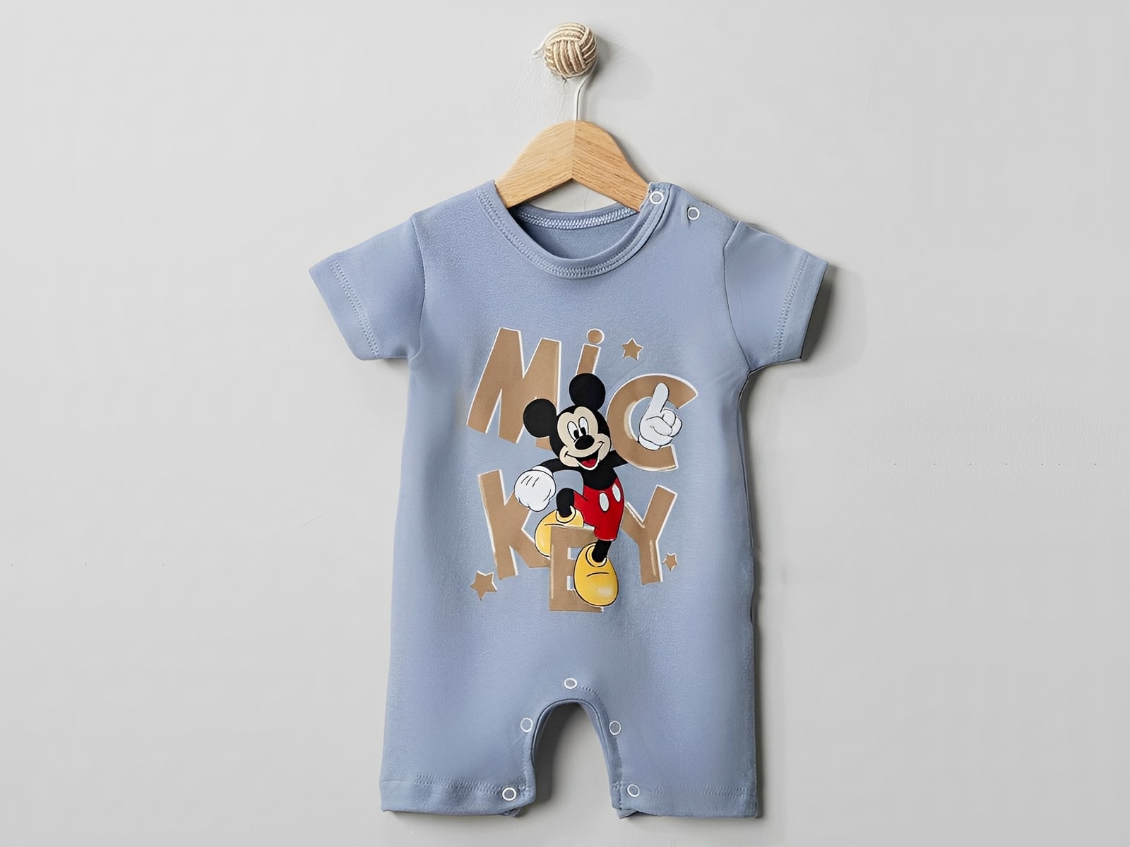 Φορμάκι κοντομάνικο καλοκαιρινό σε μπλε χρώμα με σχέδιο στάμπα αγαπημένο ποντικάκι ήρωα κινουμένων σχεδίων των παιδιών. Στο τελείωμά του το φορμάκι έχει ανοιχτά ποδαράκια και άνοιγμα με τρουκς στο κάτω μέρος, για εύκολη αλλαγή πάνας.