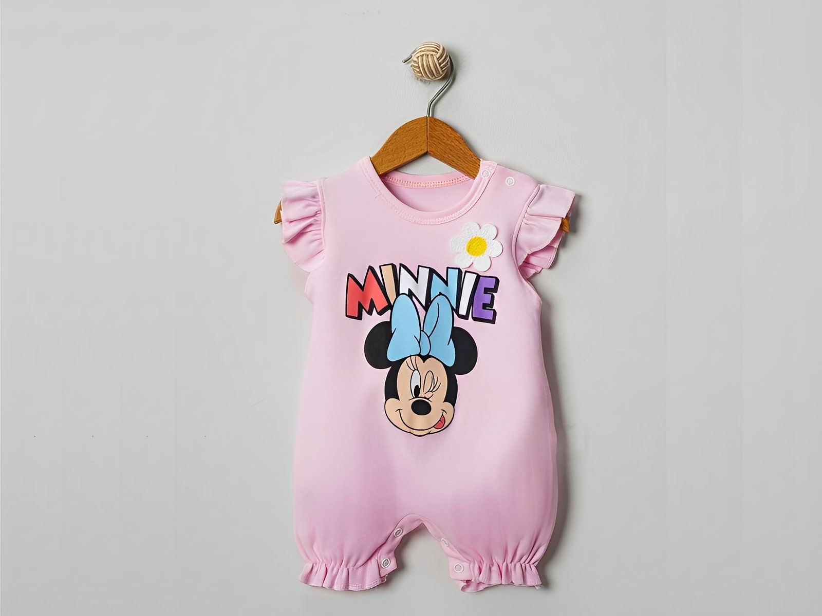 Φορμάκι κοντομάνικο καλοκαιρινό σε ροζ χρώμα με σχέδιο στάμπα αγαπημένο ποντικάκι ηρωίδα κινουμένων σχεδίων των κοριτσιών. Στο τελείωμά του το φορμάκι έχει ανοιχτά ποδαράκια και άνοιγμα με τρουκς στο κάτω μέρος, για εύκολη αλλαγή πάνας.