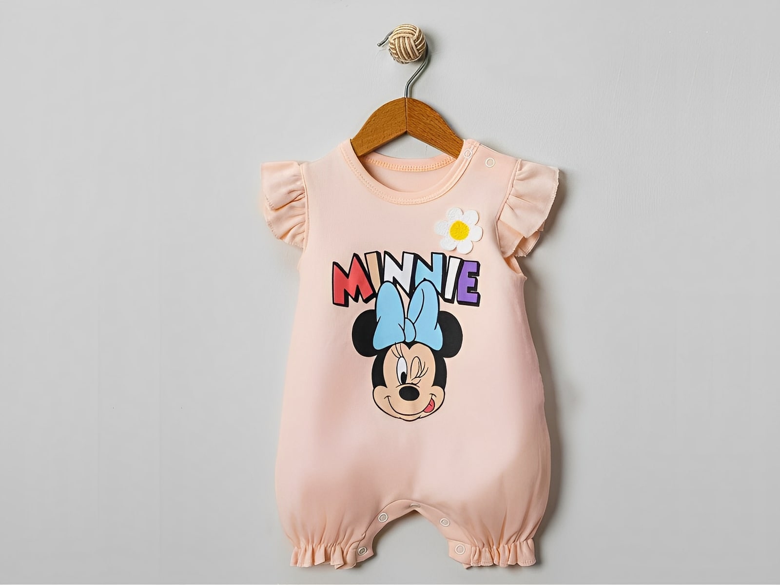 Φορμάκι κοντομάνικο καλοκαιρινό σε σομόν χρώμα με σχέδιο στάμπα αγαπημένο ποντικάκι ηρωίδα κινουμένων σχεδίων των κοριτσιών. Στο τελείωμά του το φορμάκι έχει ανοιχτά ποδαράκια και άνοιγμα με τρουκς στο κάτω μέρος, για εύκολη αλλαγή πάνας.