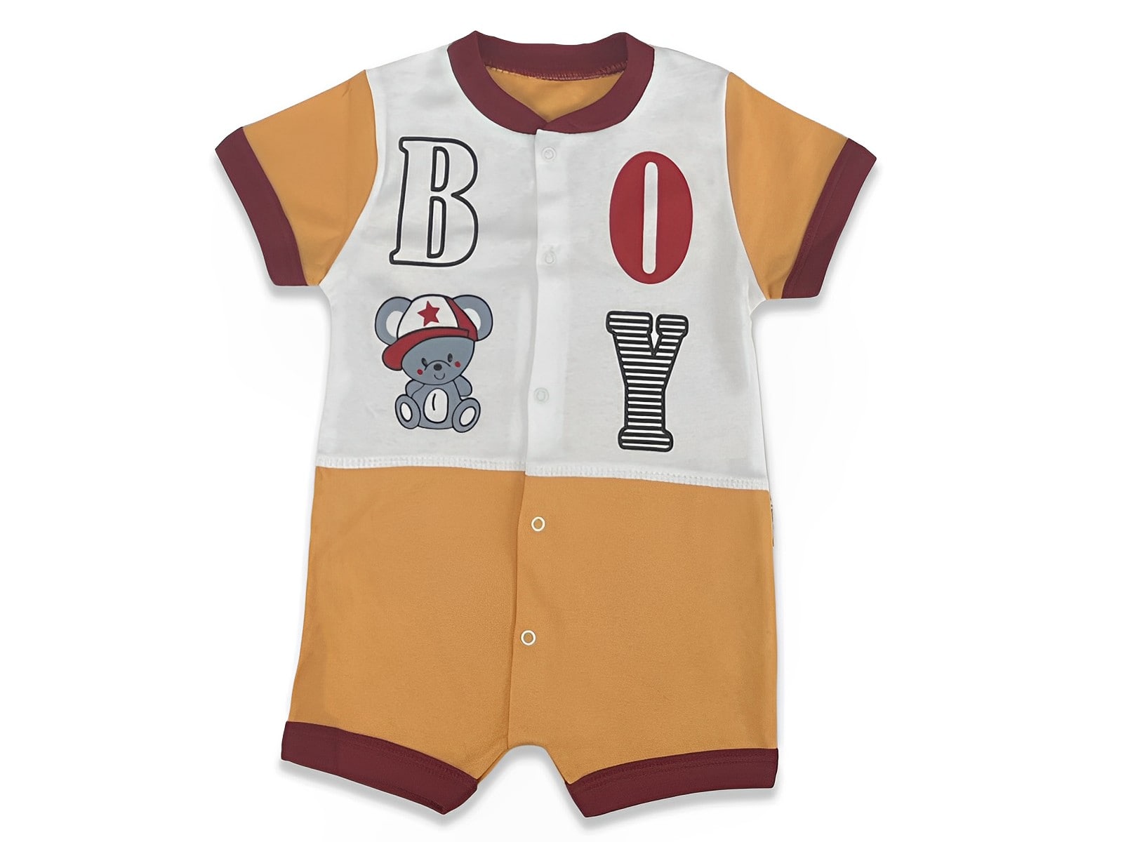 Βρεφικό φορμάκι κοντομάνικο σε κίτρινο – άσπρο χρώμα με σχέδιο στάμπα αρκουδάκι και γράφει “Boy”. Στο τελείωμά του το φορμάκι έχει ανοιχτά ποδαράκια και άνοιγμα με τρουκς στο κάτω μέρος, για εύκολη αλλαγή πάνας.