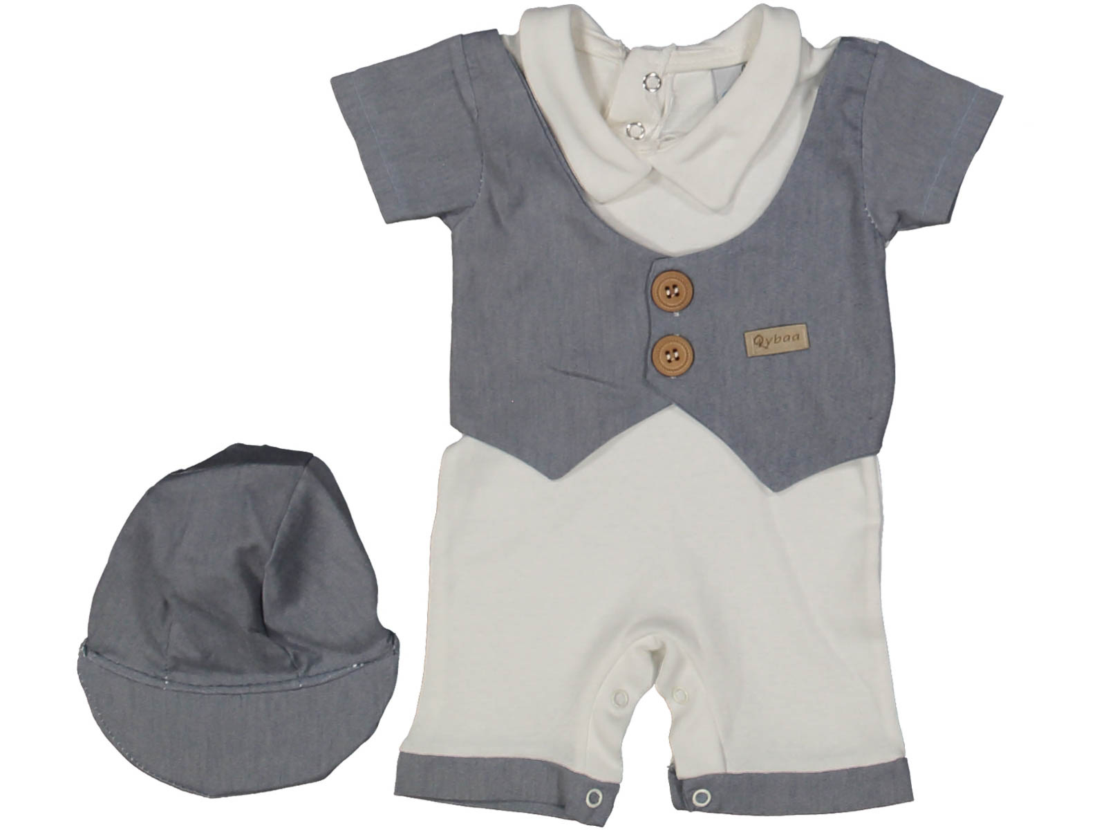 Φορμάκι κοντομάνικο σε γκρι χρώμα με σχέδιο ενιαίο γιλεκάκι και έχει σχέδιο ραμμένα κουμπάκια. Το καπελάκι είναι σε γκρι χρώμα. Το φορμάκι έχει άνοιγμα με τρουκς στο πίσω μέρος και στο τελείωμά του το φορμάκι έχει ανοιχτά ποδαράκια και άνοιγμα με τρουκς στο κάτω μέρος, για εύκολη αλλαγή πάνας.