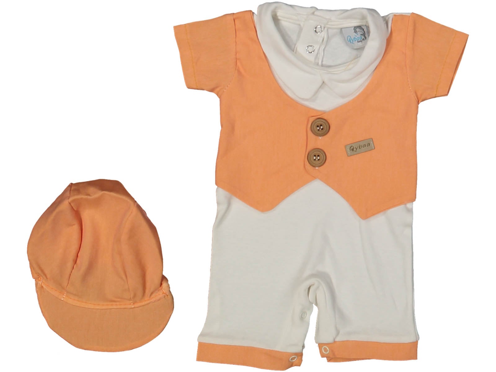 Φορμάκι κοντομάνικο σε πορτοκαλί χρώμα με σχέδιο ενιαίο γιλεκάκι και έχει σχέδιο ραμμένα κουμπάκια. Το καπελάκι είναι σε πορτοκαλί χρώμα. Το φορμάκι έχει άνοιγμα με τρουκς στο πίσω μέρος και στο τελείωμά του το φορμάκι έχει ανοιχτά ποδαράκια και άνοιγμα με τρουκς στο κάτω μέρος, για εύκολη αλλαγή πάνας.