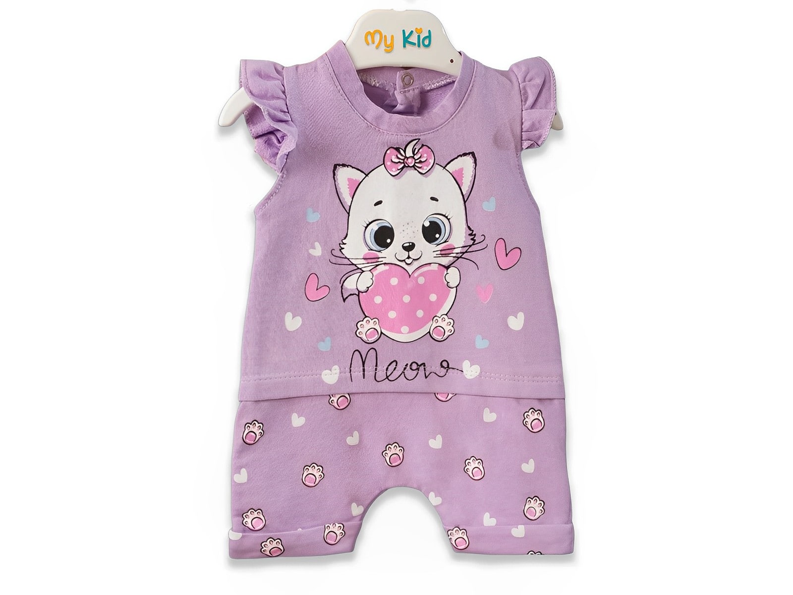 Φορμάκι βρεφικό κοντομάνικο σε λιλά χρώμα με σχέδιο στάμπα γατούλα, με καρδούλα. Στο τελείωμά του το φορμάκι έχει ανοιχτά ποδαράκια και άνοιγμα με τρουκς στο πίσω μέρος.