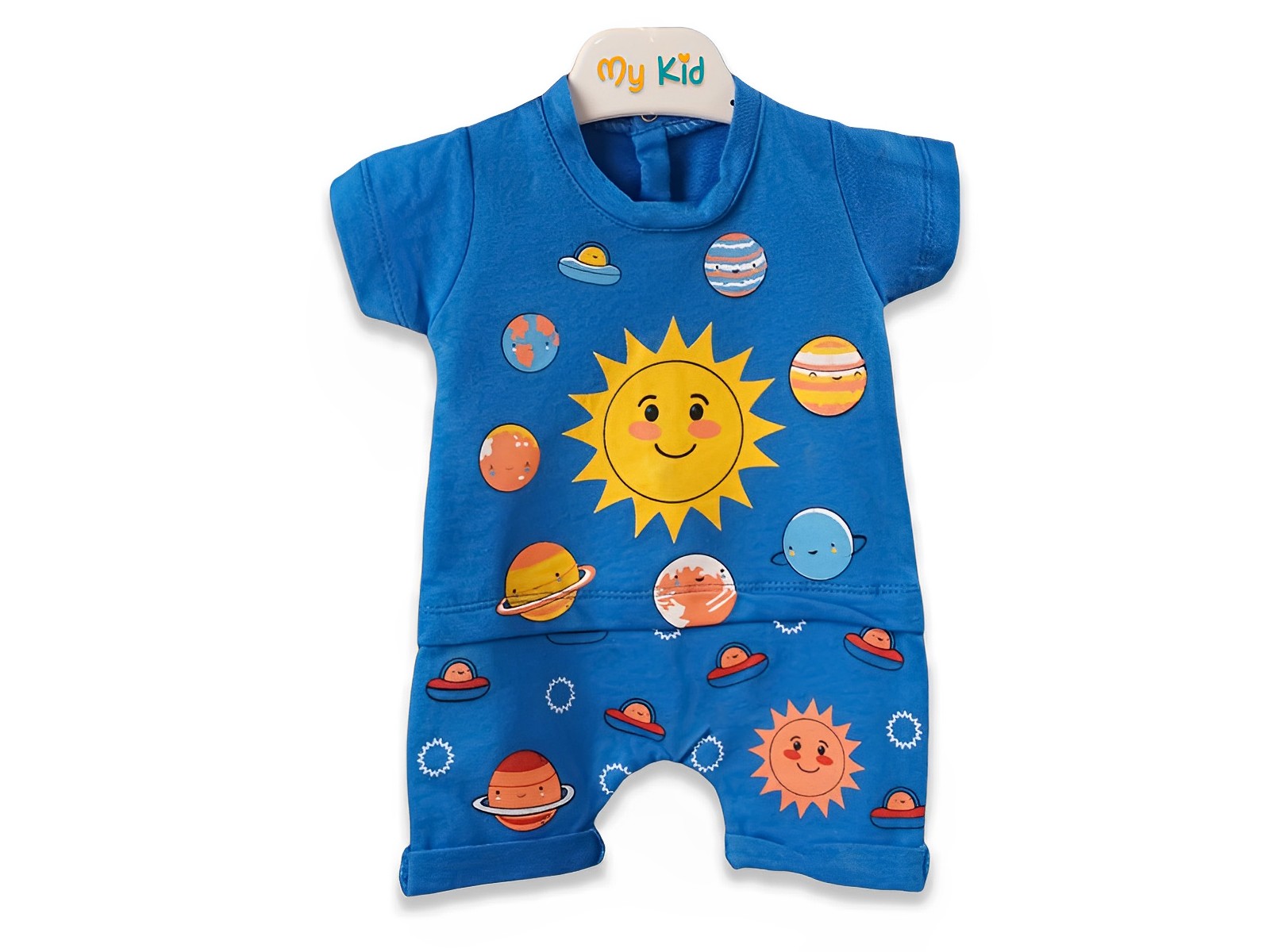 Φορμάκι βρεφικό κοντομάνικο σε μπλε χρώμα με σχέδιο στάμπα ήλιο και πλανήτες. Στο τελείωμά του το φορμάκι έχει ανοιχτά ποδαράκια και άνοιγμα με τρουκς στο πίσω μέρος.