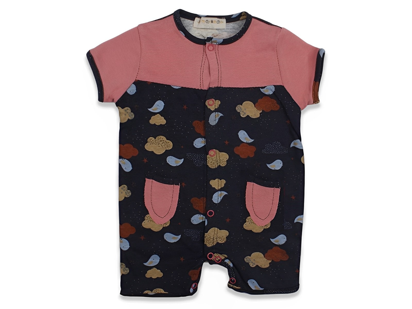 Φορμάκι βρεφικό κοντομάνικο σε σομόν – σκούρο μπλε χρώμα με στάμπα διάφορα σχεδιάκια το οποίο έχει δύο τσεπούλες στο μπροστινό του μέρος. Στο τελείωμά του το φορμάκι έχει ανοιχτά ποδαράκια και άνοιγμα με τρουκς στο κάτω μέρος, για εύκολη αλλαγή πάνας.