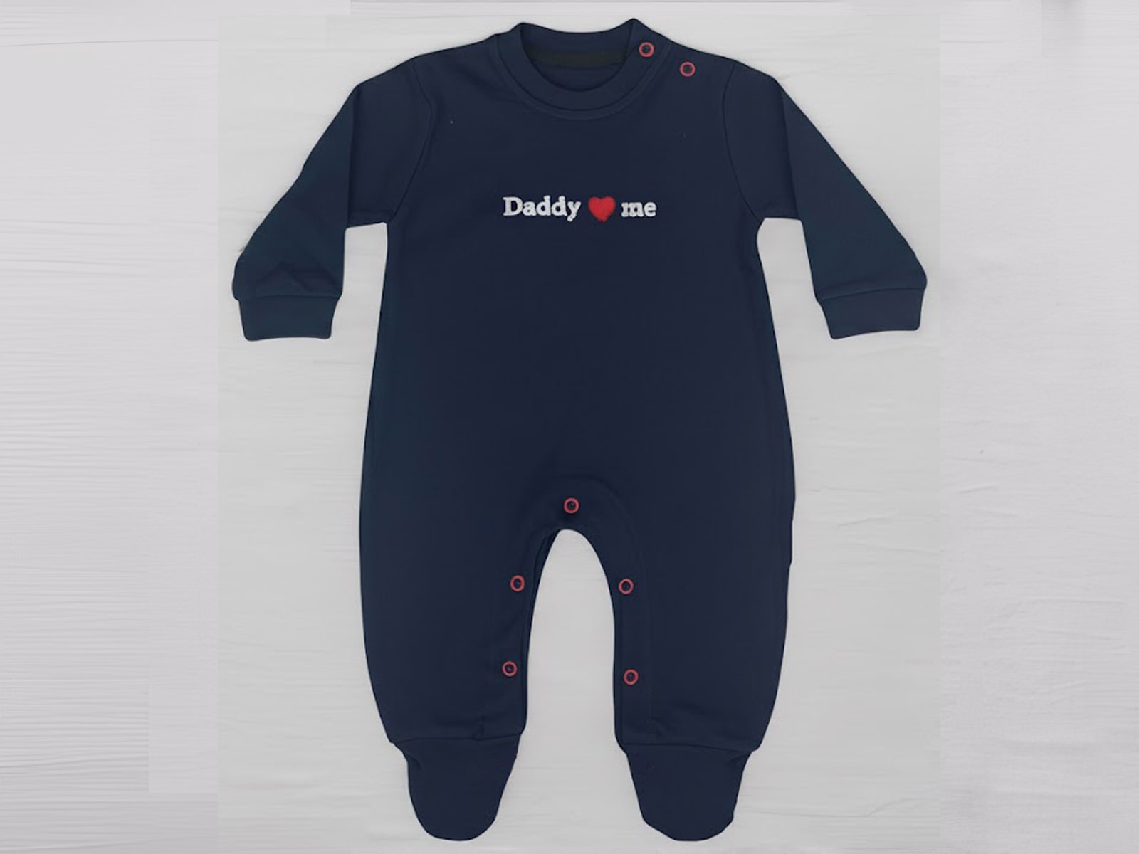 Φορμάκι σε σκούρο μπλε χρώμα με στρογγυλή λαιμόκοψη με σχέδιο στάμπα που γράφει “Daddy Loves Me”. Το φορμάκι έχει άνοιγμα με κουμπάκια (κόπιτσες) και στο τελείωμά του έχει κλειστά ποδαράκια.