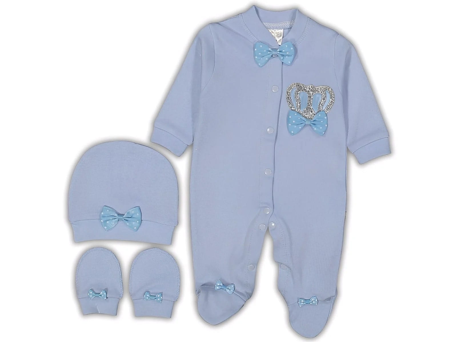 Φορμάκι μακρυμάνικο σε γαλάζιο χρώμα με στρογγυλή λαιμόκοψη. Έχει σχέδιο απλικέ κορόνα διακοσμημένη με “διαμαντάκια” και κολλημένα παπιγιόν σε γαλάζιο χρώμα κατά μήκος του ρούχου. Στο τελείωμά του το φορμάκι έχει κλειστά ποδαράκια και άνοιγμα με τρουκς ( κόπιτσες ), για εύκολη αλλαγή πάνας. Το σκουφί και τα γάντα είναι και αυτά σε γαλάζιο χρώμα με φιογκάκι.