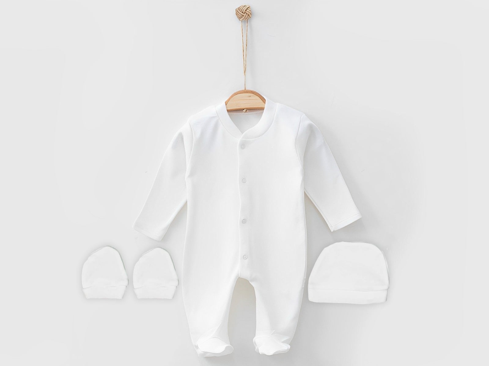 Φορμάκι μακρυμάνικο σε λευκό χρώμα με στρογγυλή λαιμόκοψη. Στο τελείωμά του το φορμάκι έχει κλειστά ποδαράκια και άνοιγμα με τρουκς ( κόπιτσες ), για εύκολη αλλαγή πάνας. Το σκουφί και τα γάντια είναι και αυτά σε λευκό χρώμα.