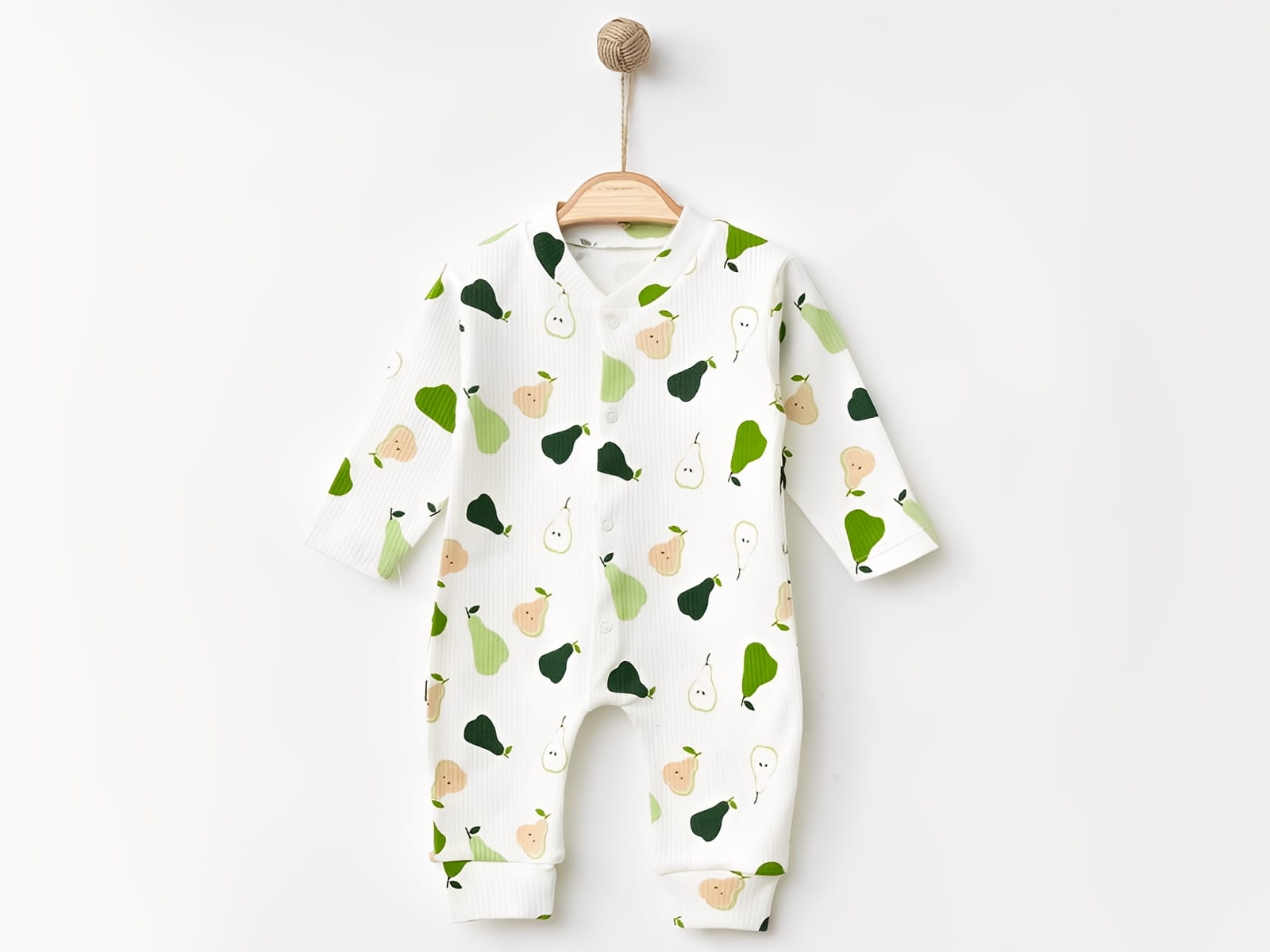 Φορμάκι βρεφικό σε άσπρο χρώμα με σχέδιο αχλαδάκια και άνοιγμα τρουκς ( κόπιτσες ) για μεγαλύτερη ευκολία. Στο τελείωμά του το φορμάκι έχει ανοιχτά ποδαράκια.