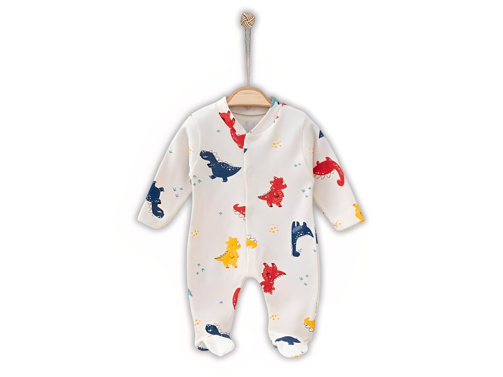 Βρεφικό φορμάκι σε άσπρο χρώμα με σχέδιο δεινοσαυραύρους και άνοιγμα τρουκς ( κόπιτσες ). Στο τελείωμά του το φορμάκι έχει κλειστά ποδαράκια.