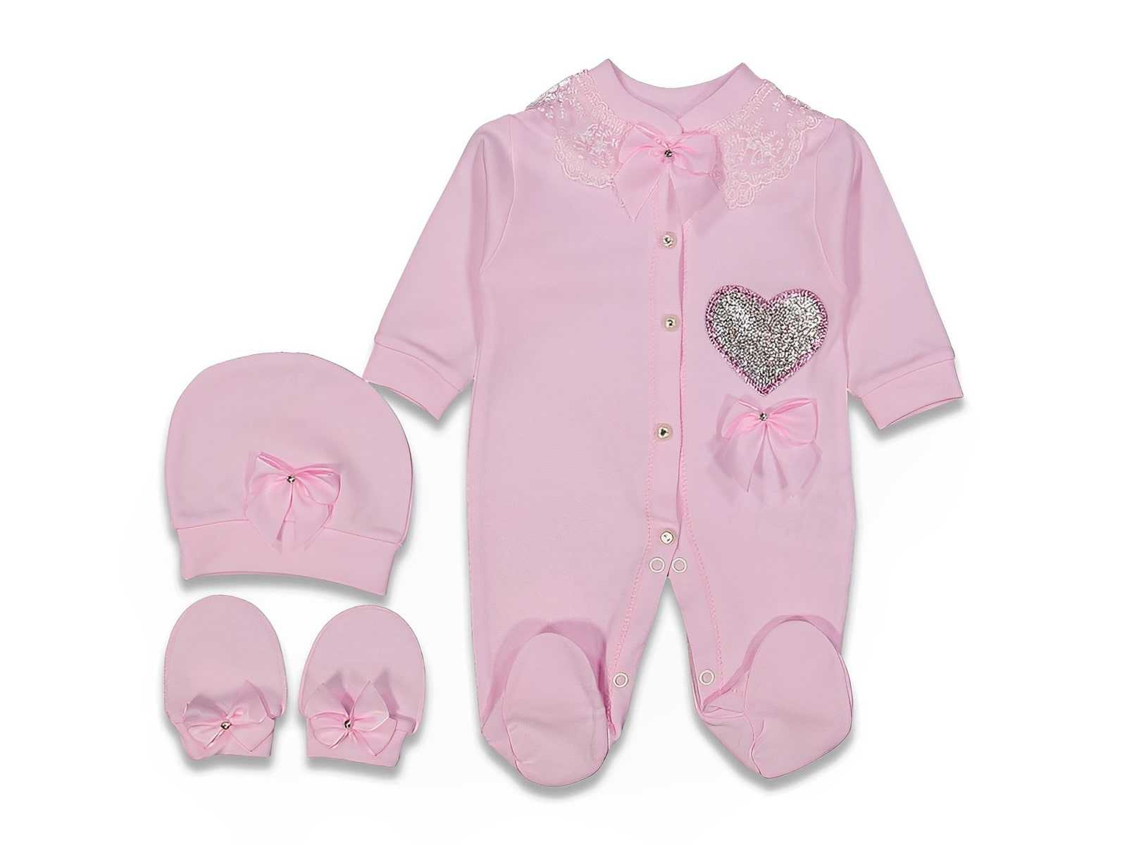 Φορμάκι μακρυμάνικο σε ροζ χρώμα το οποίο έχει δαντέλα γύρω από τον λαιμό. Έχει σχέδιο απλικέ καρδούλα διακοσμημένη με “διαμαντάκια” και κολλημένους φιόγκους σε ροζ χρώμα κατά μήκος του ρούχου. Στο τελείωμά του το φορμάκι έχει κλειστά ποδαράκια και άνοιγμα με τρουκς ( κόπιτσες ), για εύκολη αλλαγή πάνας. Το σκουφί και τα γάντα είναι και αυτά σε ροζ χρώμα με φιογκάκι.