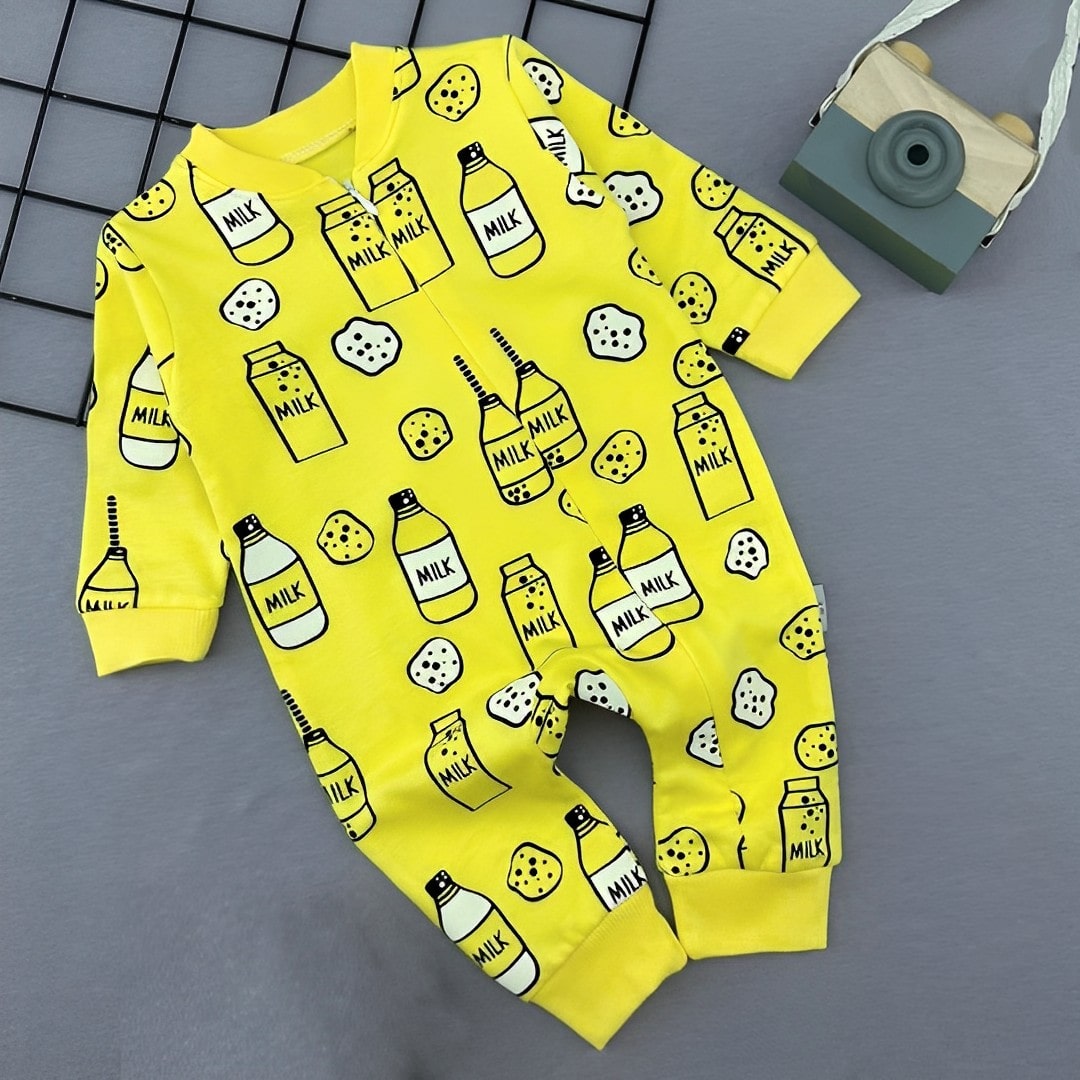 Φορμάκι με σχέδιο Μπουκάλια γάλα και μπισκότα και γράφει “Milk”, είναι σε κίτρινο χρώμα. Το φορμάκι έχει άνοιγμα με φερμουάρ και στο τελείωμά του έχει ανοιχτά ποδαράκια.