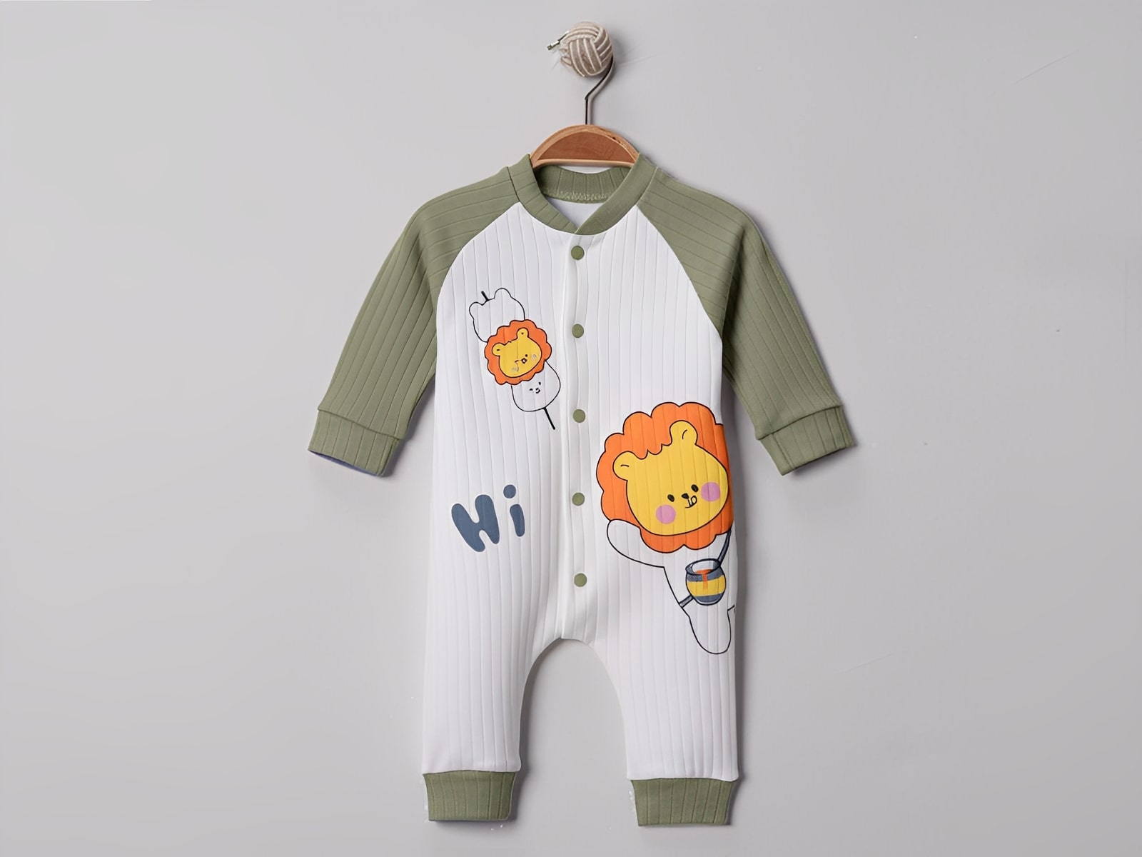 Φορμάκι με σχέδιο στάμπα ζωάκι λιονταράκι σε πράσινο χρώμα όπου γράφει “Hi”. Στο τελείωμά του το φορμάκι έχει ανοιχτά ποδαράκια και άνοιγμα με τρουκς (κόπιτσες).