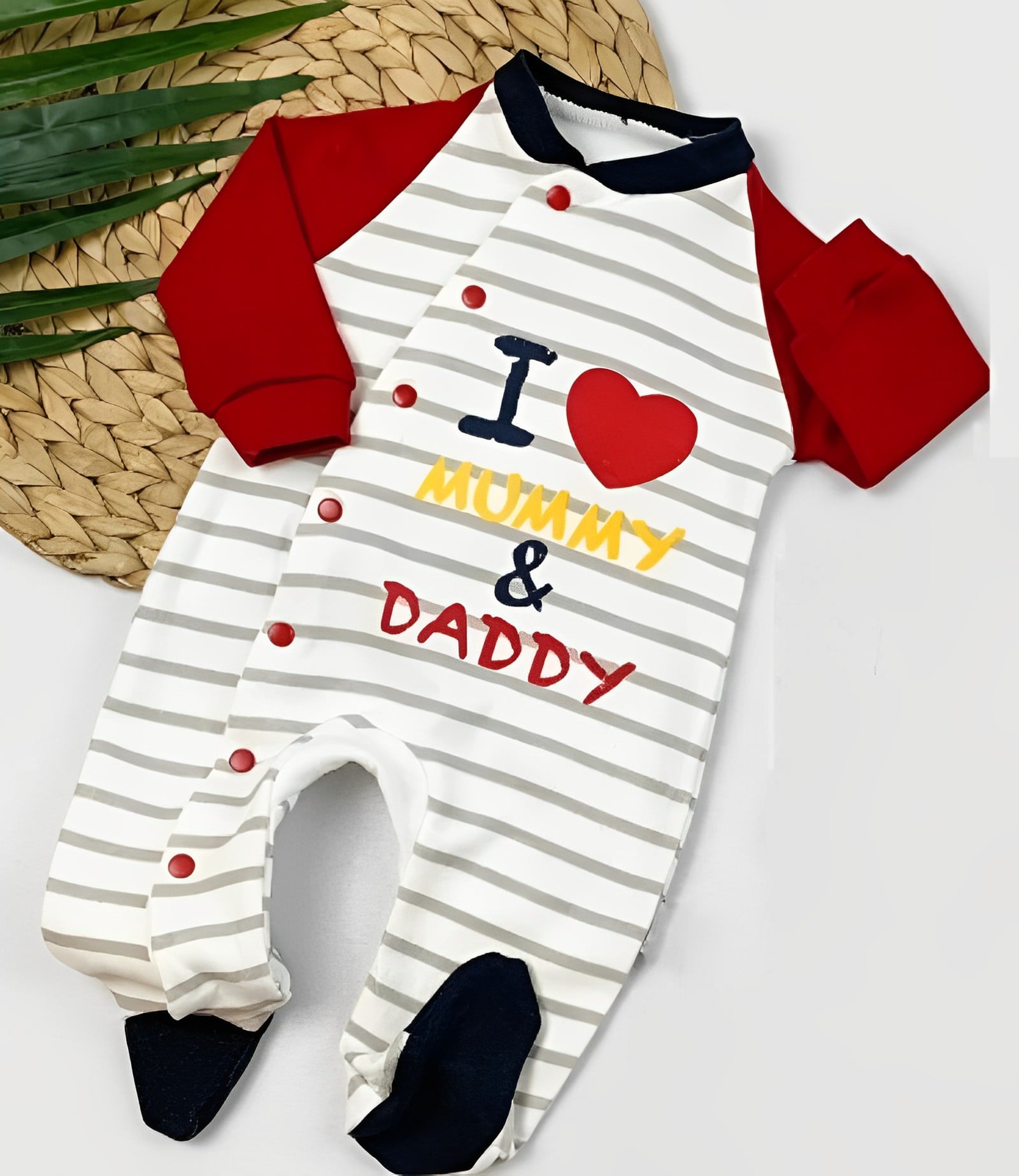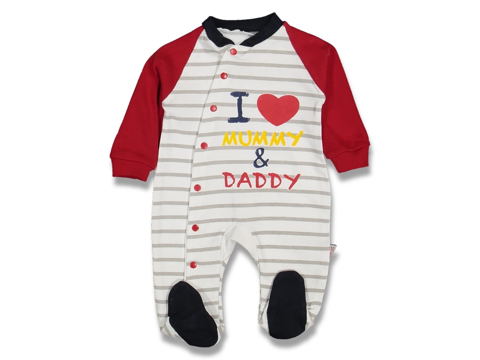 Φορμάκι με σχέδιο στάμπα ρίγες και γράφει “I Love Mommy & Daddy” σε κόκκινο χρώμα. Στο τελείωμά του το φορμάκι έχει κλειστά ποδαράκια.