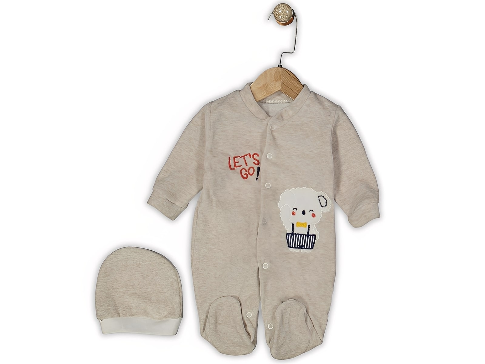 Φορμάκι και σκουφάκι βελουτέ σε γκρι χρώμα με σχέδιο ζωάκι αρκουδάκι όπου γράφει “Let’s Go” . Το φορμάκι έχει άνοιγμα με τρουκς και στο τελείωμά του έχει κλειστά ποδαράκια.