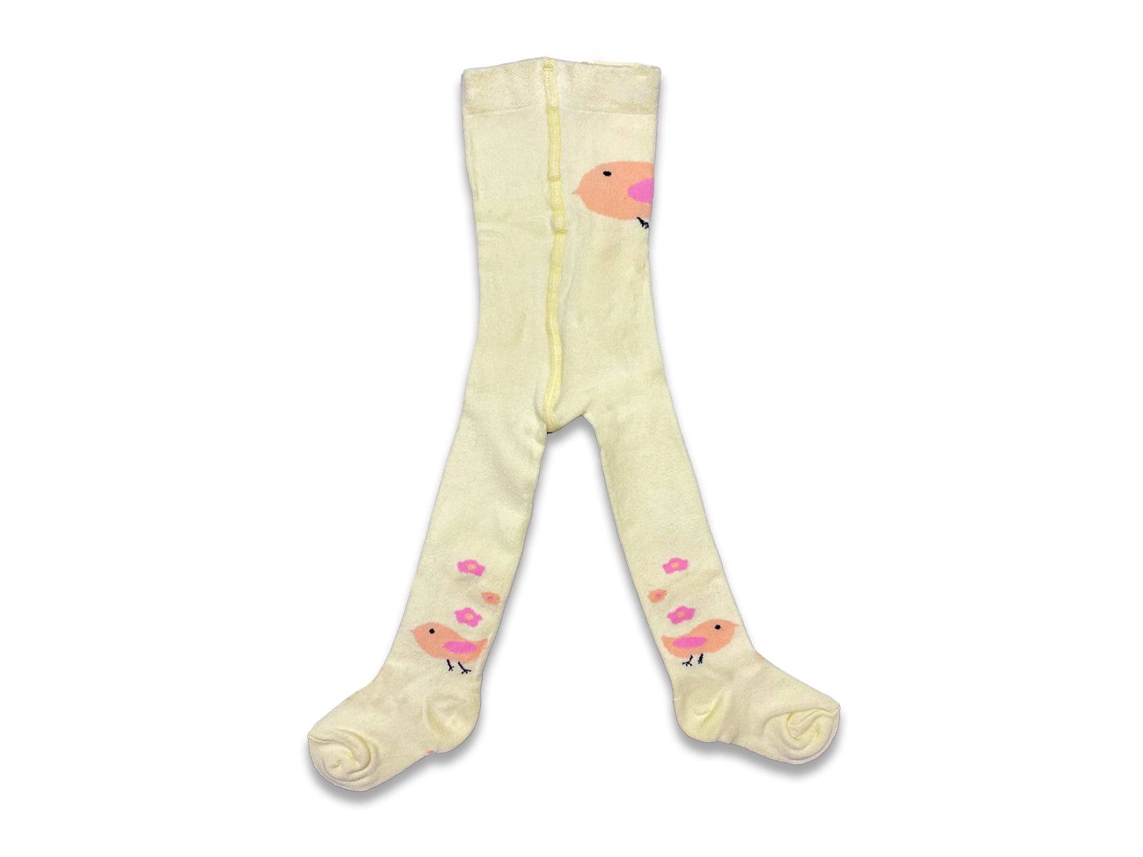Βρεφικό καλτσόν για κορίτσια με σχέδιο πουλάκια, από ελαστικό βαμβακερό ύφασμα σε χρώμα κίτρινο. Για ηλικίες από 0 έως 24 μηνών.