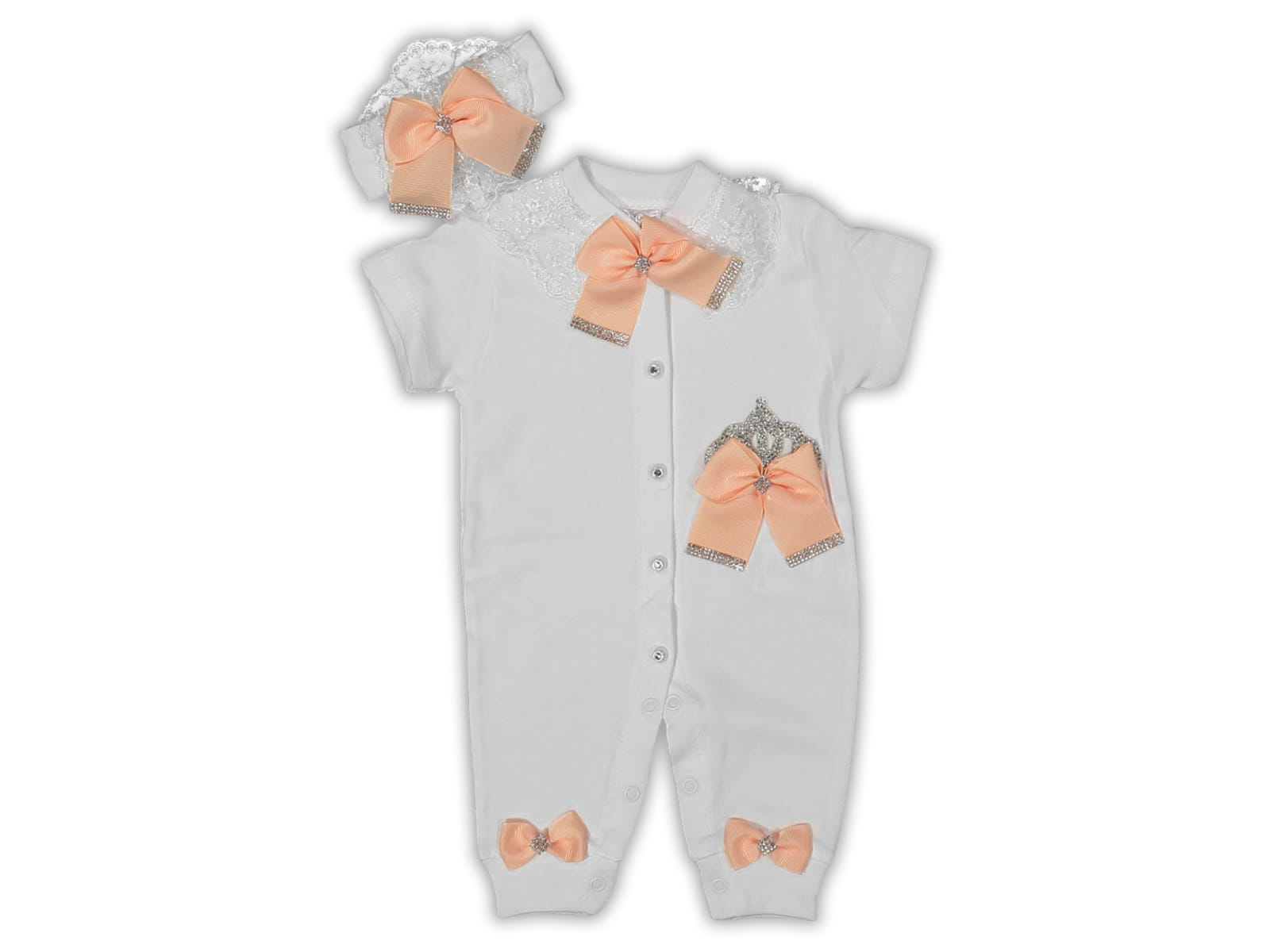 Βρεφικό Κοντομάνικο Φορμάκι Αμπιγιέ με Κορώνα, Φιόγκους και Κορδέλα – Σομόν (112658)