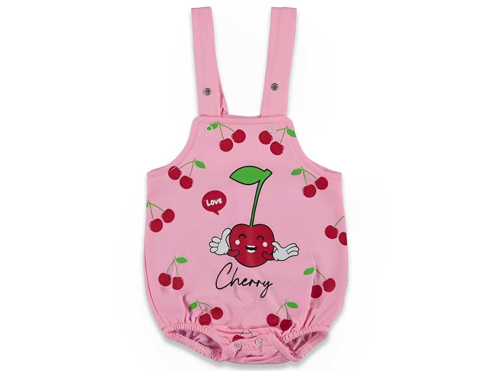 Το συγκεκριμένο κορμάκι είναι αμάνάνικο με τιράντες που έχουν κουμπάκι και προσαρμόζεται το ύψους τους. Είναι σε ροζ χρώμα με σχέδιο κεράσια και γράφει “Cherry”.