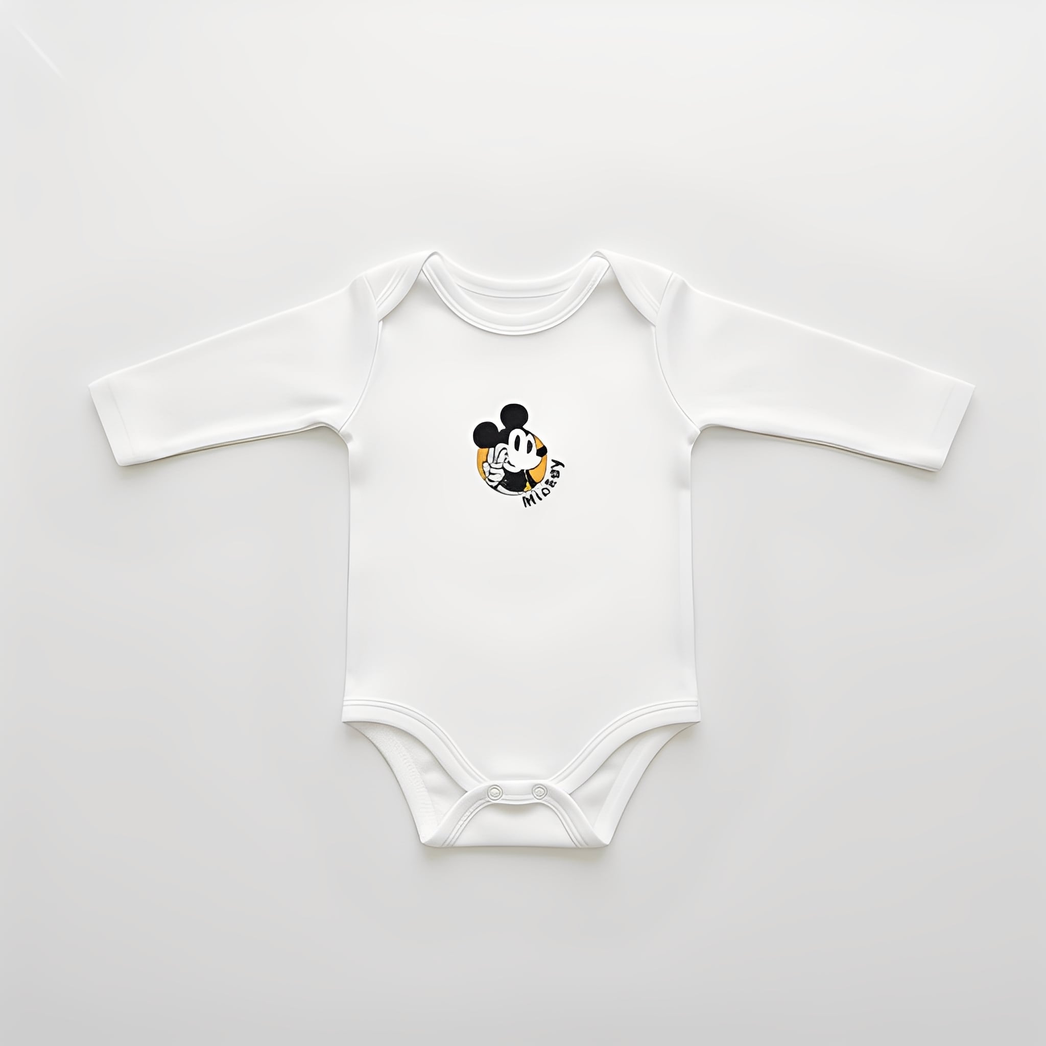 Το κορμάκι είναι μακρυμάνικο, με σχέδιο το αγαπημένο ποντικάκι των μικρών παιδιών. Το εσώρουχο αυτό έχει κλείσιμο με τρουκς (κόπιτσες) στο κάτω μέρος, για εύκολη αλλαγή πάνας.