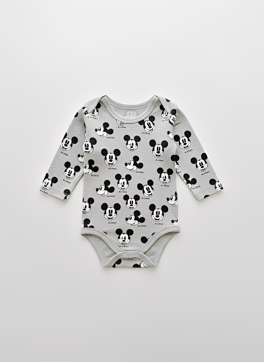 Το κορμάκι είναι μακρυμάνικο, σε γκρι χρώμα με σχέδιο το αγαπημένο ποντικάκι των μικρών παιδιών. Το εσώρουχο αυτό έχει κλείσιμο με τρουκς (κόπιτσες) στο κάτω μέρος, για εύκολη αλλαγή πάνας.
