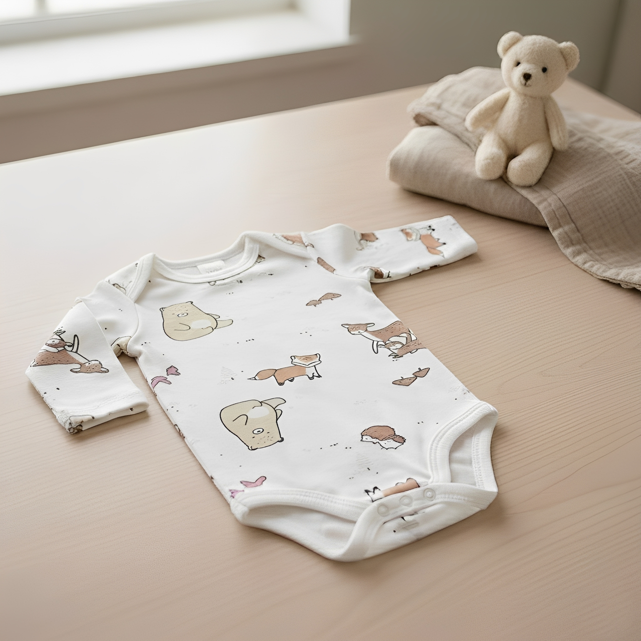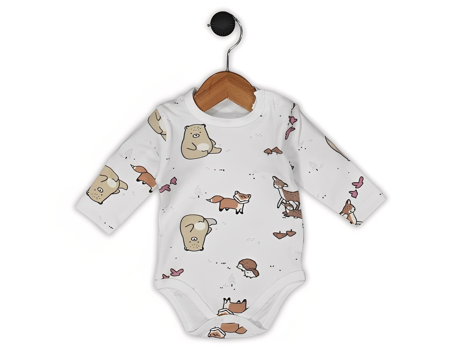 Το κορμάκι είναι μακρυμάνικο, σε λευκό χρώμα και έχει στάμπα που γράφει πολλά διαφορετικά ζωάκια. Το εσώρουχο αυτό έχει κλείσιμο με τρουκς (κόπιτσες) στο κάτω μέρος, για εύκολη αλλαγή πάνας.
