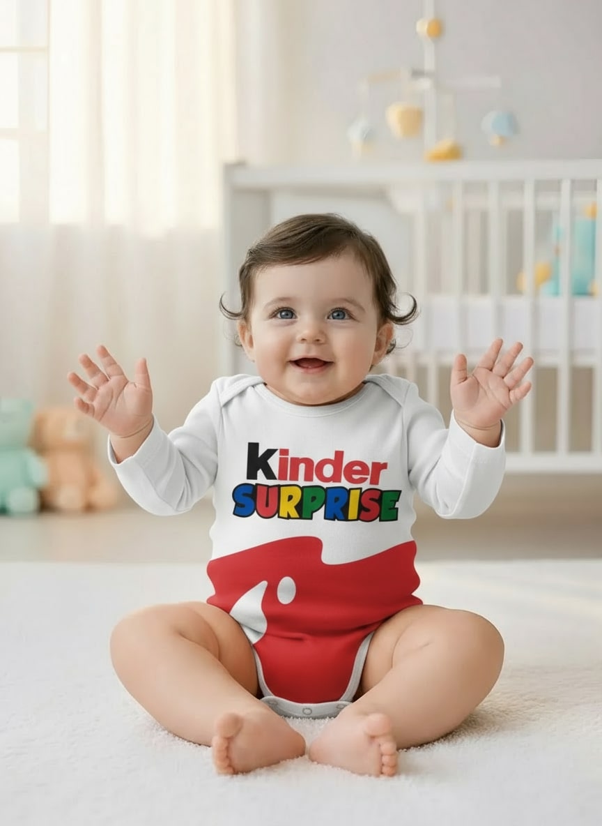 Το κορμάκι είναι μακρυμάνικο, σε σχέδιο γλυκό σε άσπρο και κόκκινο χρώμα. Το εσώρουχο αυτό έχει κλείσιμο με τρουκς (κόπιτσες) στο κάτω μέρος, για εύκολη αλλαγή πάνας.