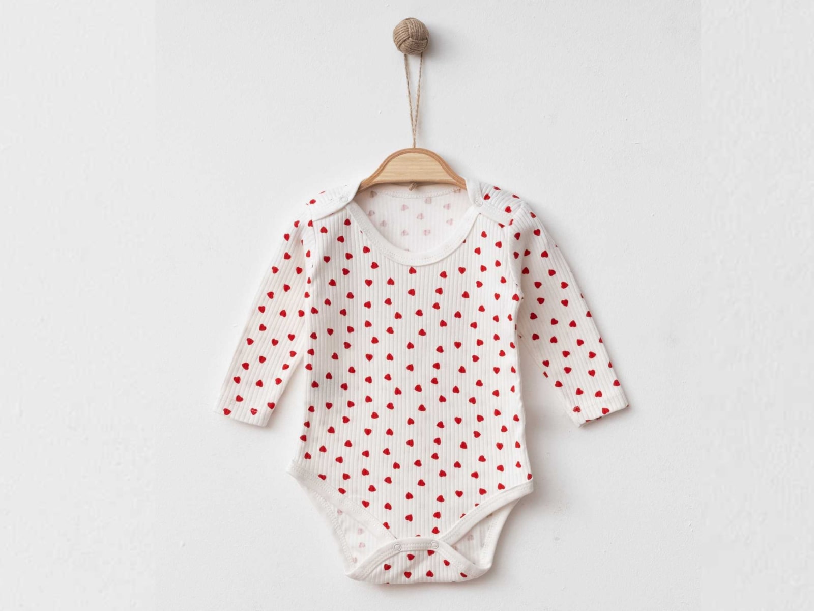 Το κορμάκι (ζιπουνάκι) είναι μακρυμάνικο σε άσπρο χρώμα και έχει σχέδιο κόκκινες καρδούλες. Το εσώρουχο αυτό έχει κλείσιμο με τρουκς στο κάτω μέρος, για εύκολη αλλαγή πάνας.
