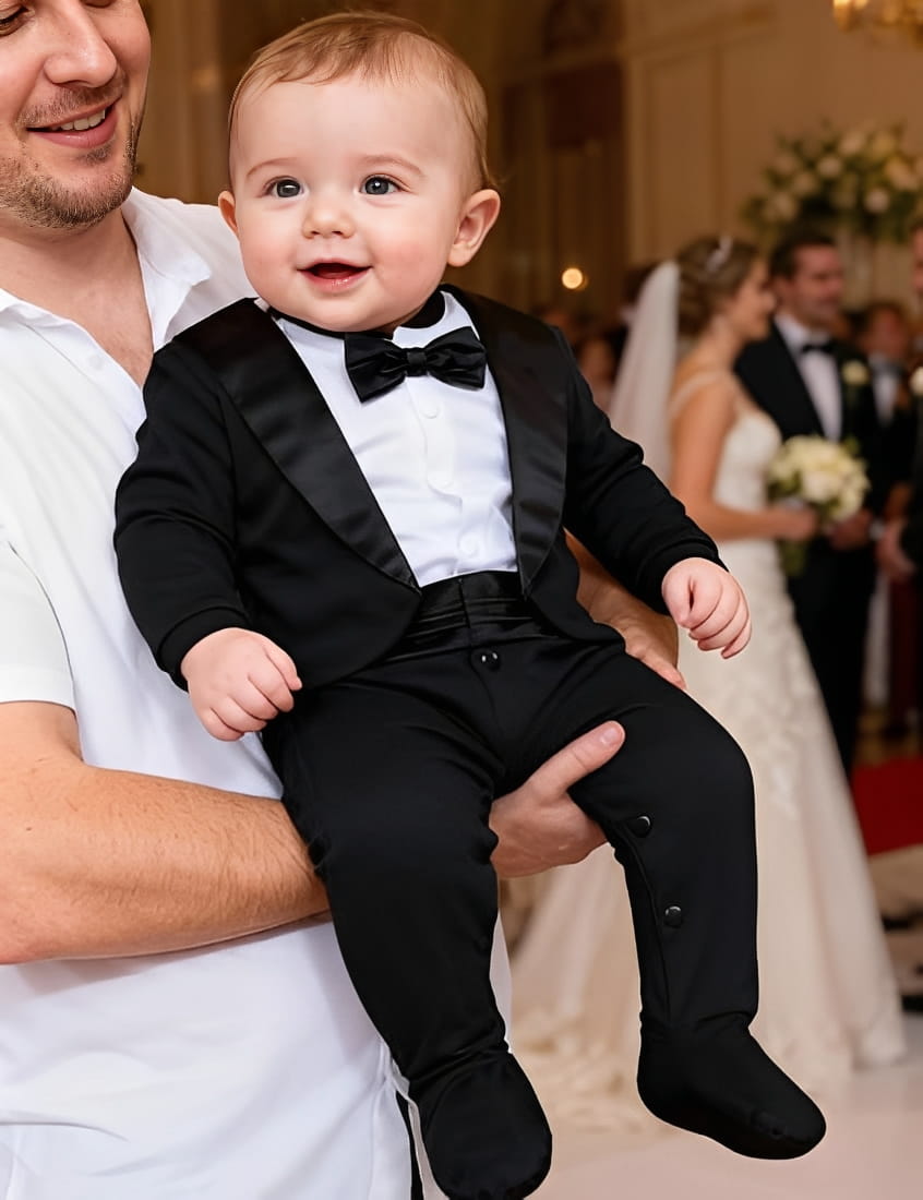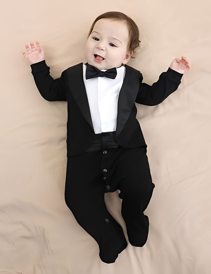 Ένα εξαιρετικά κομψό βρεφικό ολόσωμο φορμάκι υψηλής αισθητικής, σχεδιασμένο για τις πιο σημαντικές και αξέχαστες στιγμές. Εμπνευσμένο από το κλασικό ανδρικό σμόκιν συνδυάζει εντυπωσιακή εμφάνιση με άνεση και πρακτικότητα.