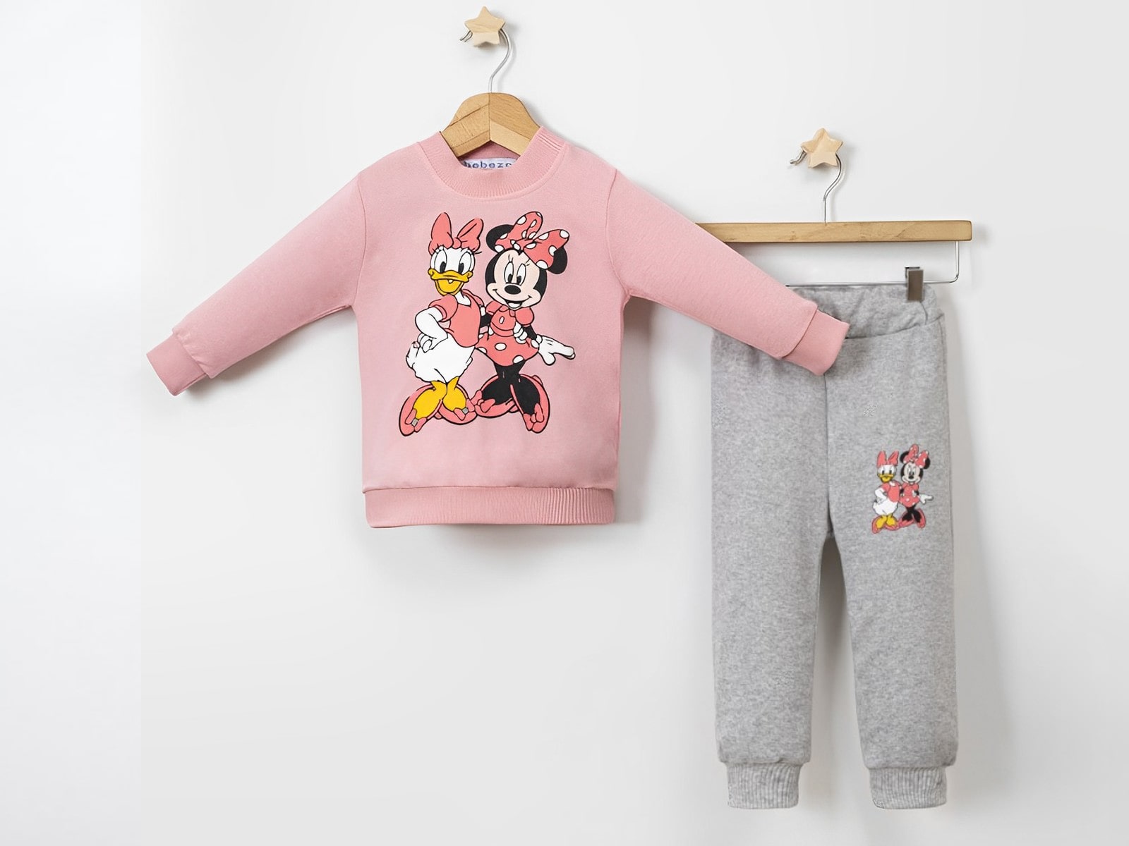 Το σετ φόρμα αποτελείται από μπλούζα και παντελόνι από λεπτό φούτερ ύφασμα. Η μπλουζίτσα είναι μακρυμάνικη σε ροζ χρώμα με στάμπα ήρωα κινουμένων σχεδίων. Το παντελονάκι είναι σε γκρι χρώμα με σχέδιο στάμπα και έχει λάστιχο περιμετρικά στη μέση και στο κάτω μέρος.