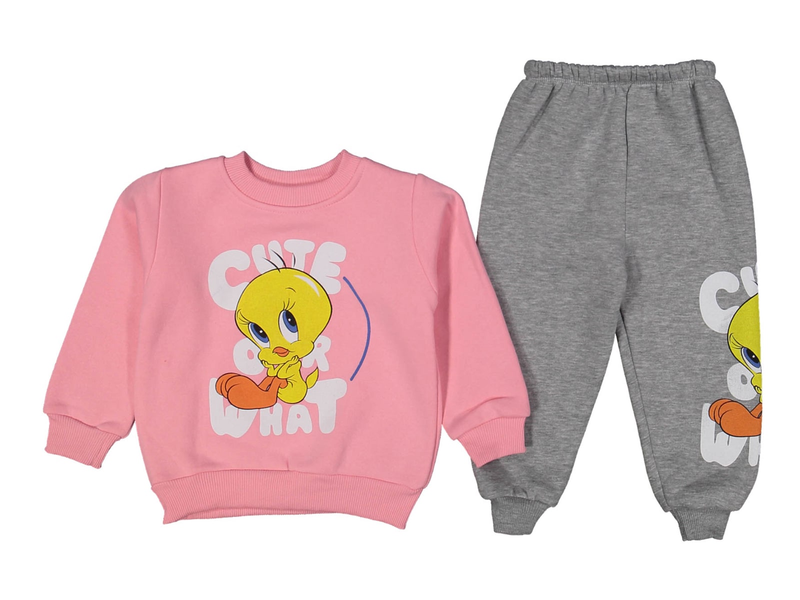 Το σετ αποτελείται από βρεφική μπλούζα και παντελόνι και είναι χειμερινό, με εσωτερική επένδυση χνούδι φλις (fleece). Η μπλουζίτσα είναι σε ροζ χρώμα με σχέδιο στάμπα ήρωα κινουμένων σχεδίων “Cute or What”. Το παντελονάκι έχει σχέδιο στάμπα και λάστιχο περιμετρικά στη μέση και στο κάτω μέρος.