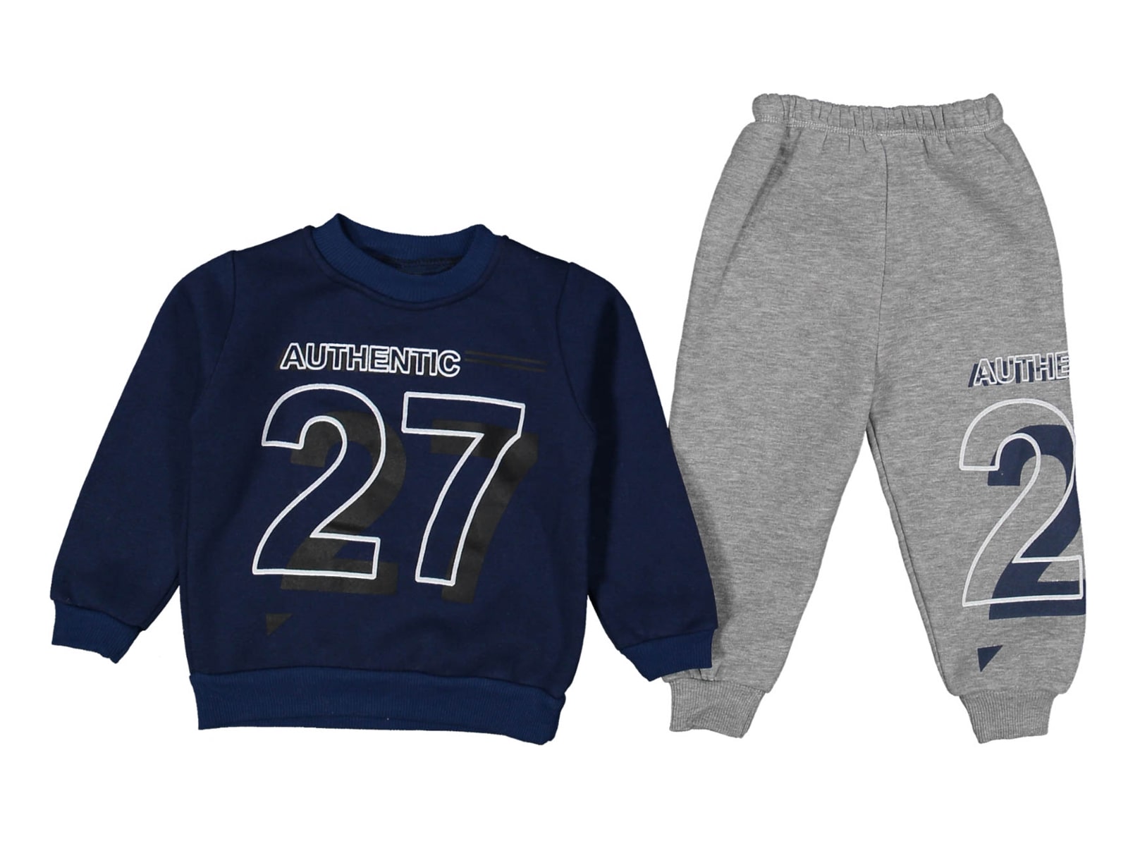 Το σετ αποτελείται από βρεφική μπλούζα και παντελόνι και είναι χειμερινό, με εσωτερική επένδυση χνούδι φλις (fleece). Η μπλουζίτσα είναι σε σκούρο μπλε χρώμα με σχέδιο στάμπα και γράφει “Authentic 27”. Το παντελονάκι έχει σχέδιο στάμπα και λάστιχο περιμετρικά στη μέση και στο κάτω μέρος.