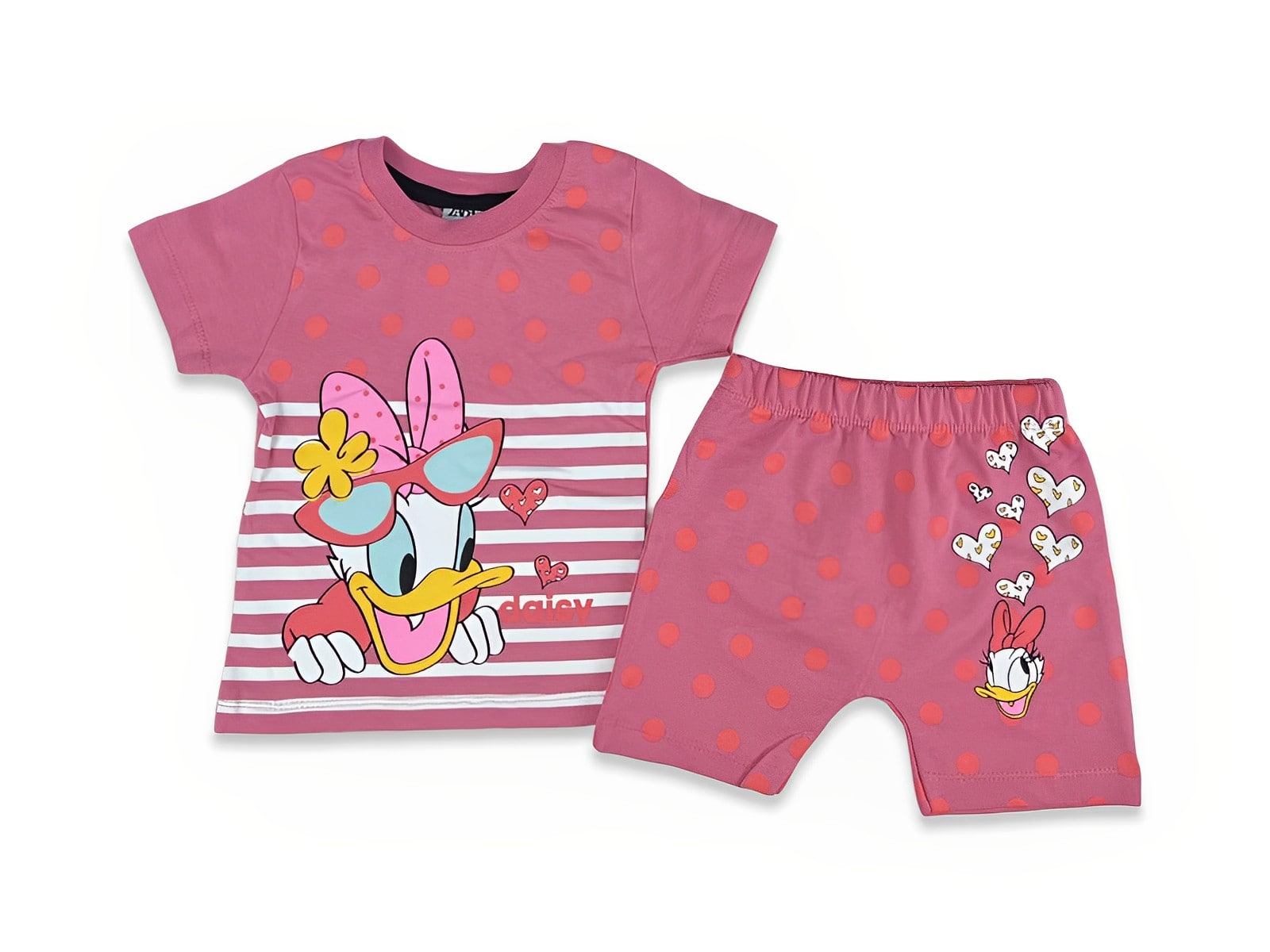 Το σετ αυτό αποτελείται από μία κοντομάνικη μπλουζίτσα και ένα κοντό παντελονάκι. Η μπλούζα είναι σε πούδρα χρώμα με ριγωτό σχέδιο και απεικονίζει την αγαπημένη ήρωα κινουμένων σχεδίων. To παντελόνι είναι σε πούδρα χρώμα με πουά σχέδιο και έχει λάστιχο περιμετρικά στην μέση.