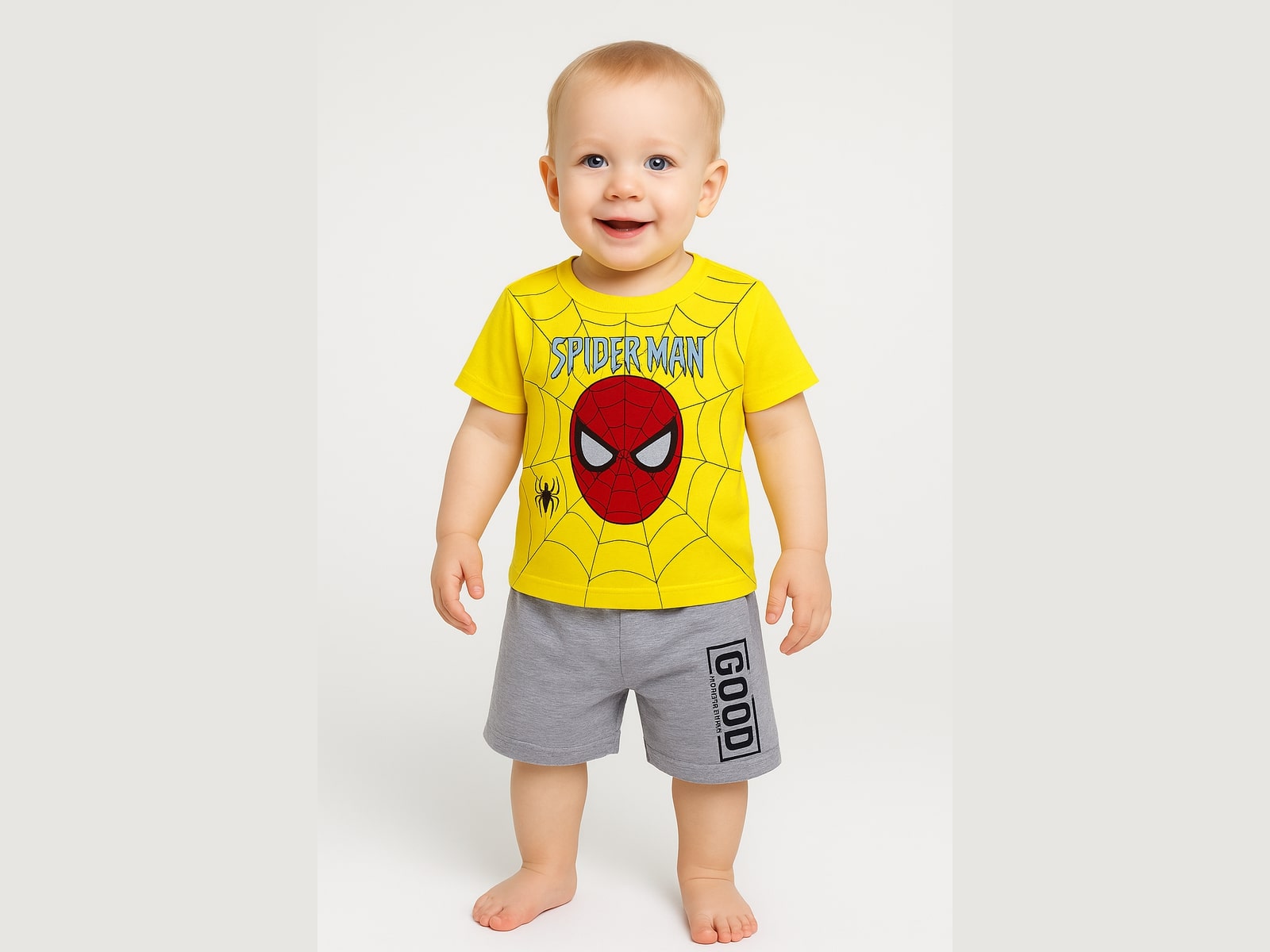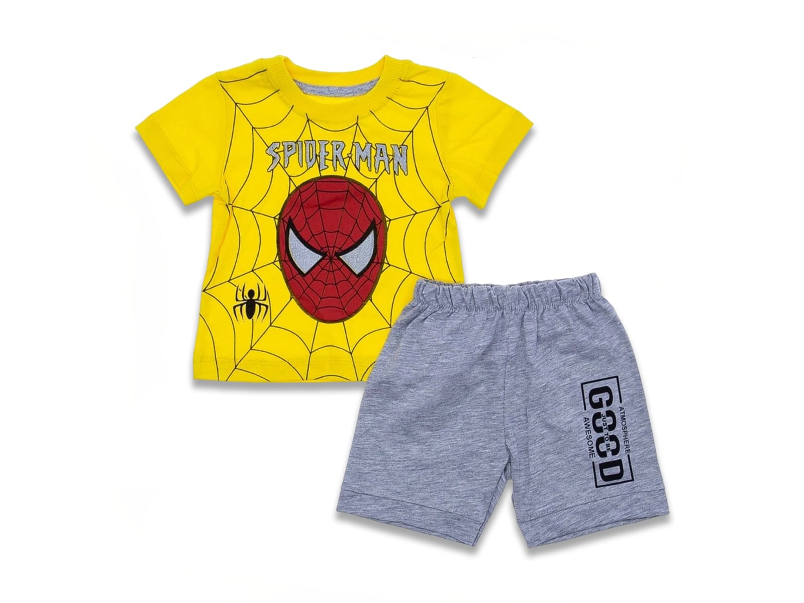 Το σετ αυτό αποτελείται από μία κοντομάνικη μπλούζα και ένα παντελόνι βερμούδα. Η μπλουζίτσα είναι σε κίτρινο χρώμα και έχει σχέδιο στάμπα υπερήρωα. Η βερμούδα είναι σε γκρι χρώμα και έχει λάστιχο περιμετρικά στη μέση.