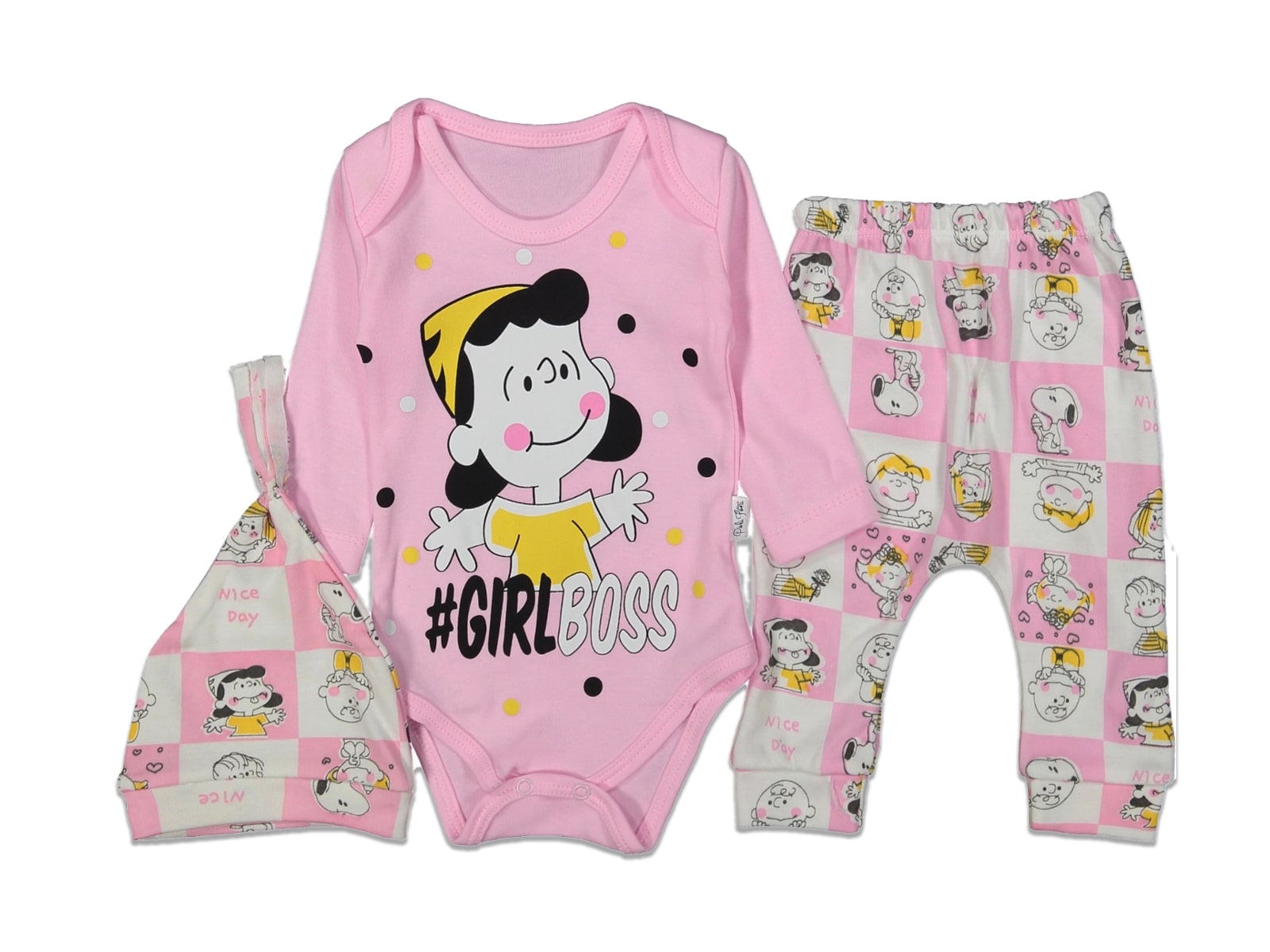 Το σετ αποτελείται από ένα κορμάκι, ένα παντελονάκι και ένα σκουφάκι. Το κορμάκι είναι ροζ και γράφει “#Girl Boss”. Το σκουφάκι είναι σε ροζ χρώμα, όπως και το παντελονάκι, και έχουν σχέδιο ήρωες κινουμένων σχεδίων. Το παντελόνι έχει λάστιχο περιμετρικά και στο κάτω μέρος.