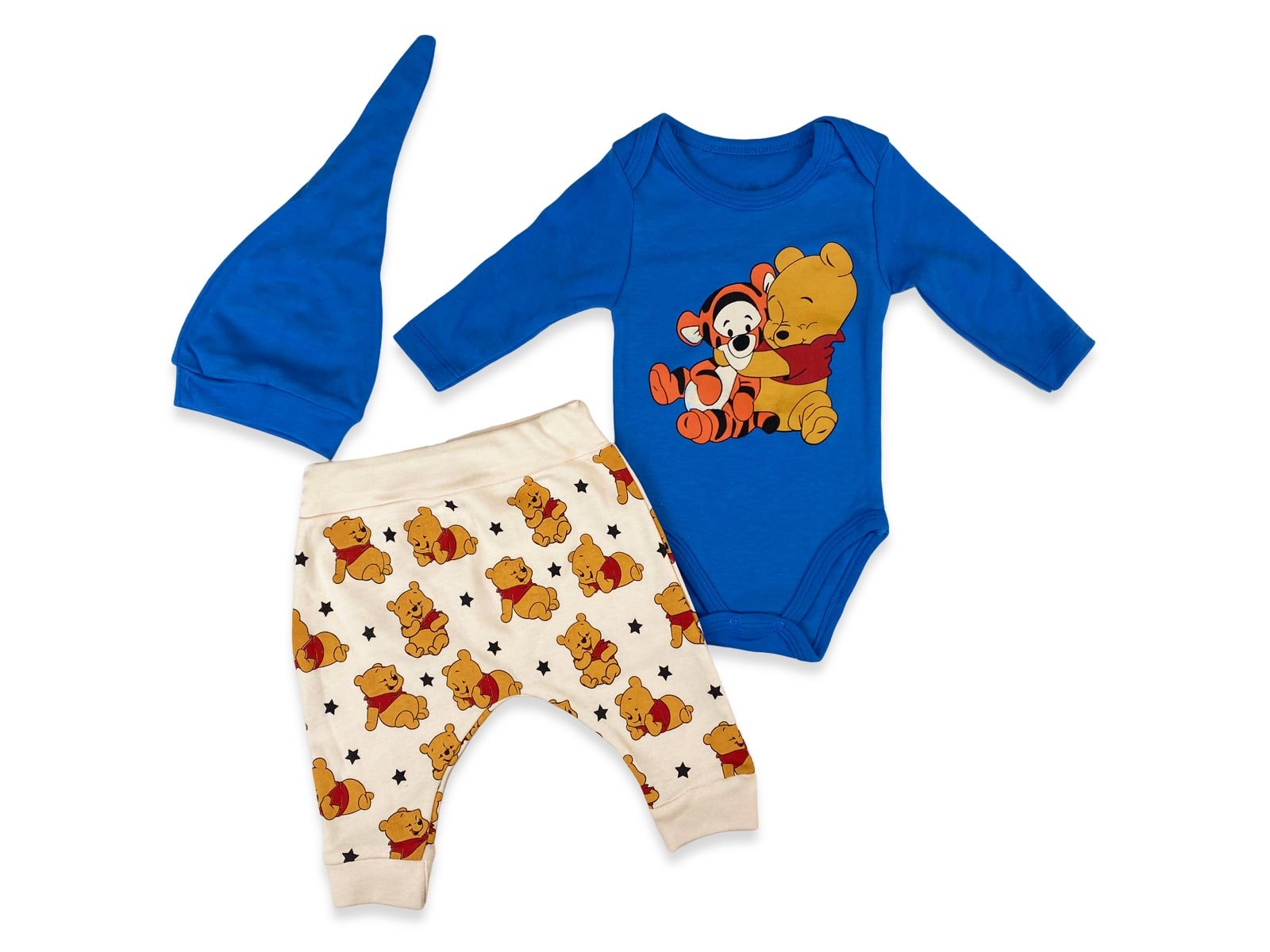 Το σετ αποτελείται από ένα κορμάκι, παντελόνι και σκουφί. Το κορμάκι (ζιπουνάκι) είναι σε μπλε χρώμα με σχέδιο στάμπα ήρωες κινουμένων σχεδίων. Το σκουφάκι είναι μονόχρωμο μπλε. Το παντελονάκι έχει σχέδιο ήρωες κινουμένων σχεδίων, και λάστιχο περιμετρικά στην μέση και στους αστραγάλους.