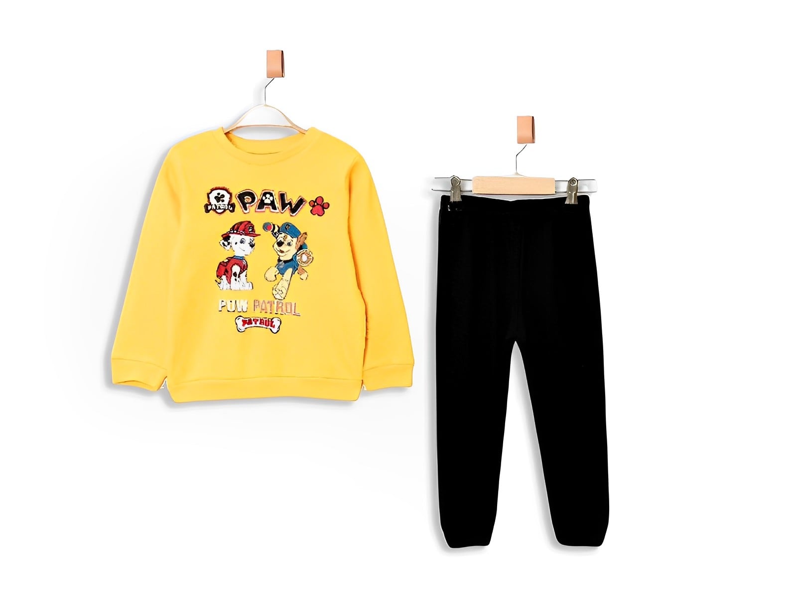 Το σετ είναι λεπτό μακό φθινοπωρινό-ανοιξιάτικο και αποτελείται από μπλούζα και παντελόνι. Η μπλουζίτσα είναι σε κίτρινο χρώμα και έχει σχέδιο στάμπα τα αγαπημένα σκυλάκια των κινουμένων σχεδίων των παιδιών! Το παντελονάκι είναι σε μαύρο χρώμα, ενώ έχει λάστιχο περιμετρικά στη μέση και στο κάτω μέρος. Ιδανικό για τις καθημερινές βόλτες αλλά και το σχολείο!