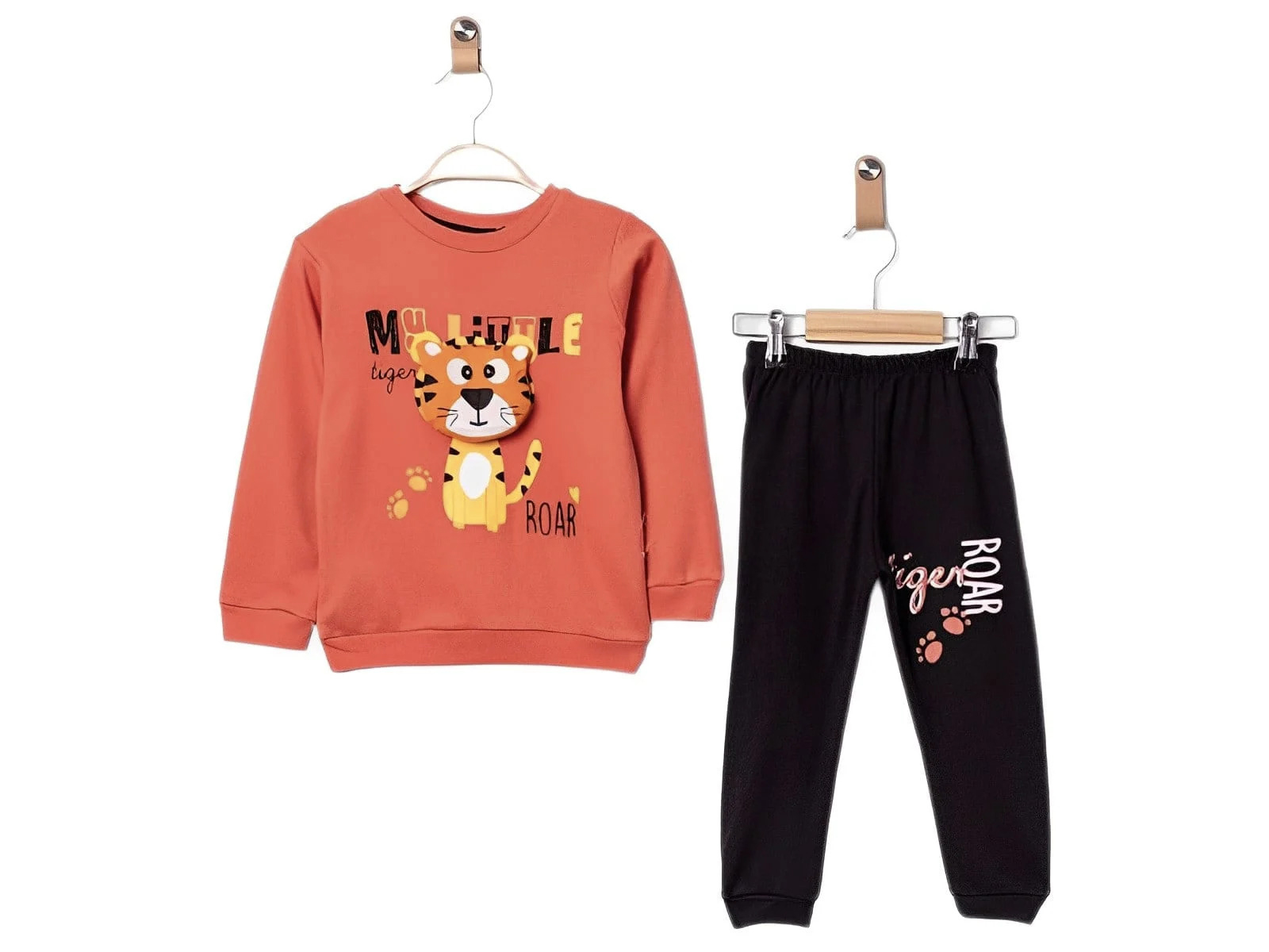 Το σετ είναι λεπτό μακό φθινοπωρινό-ανοιξιάτικο και αποτελείται από μπλούζα και παντελόνι. Η μπλουζίτσα είναι σε κεραμιδί χρώμα και έχει τρισδιάστατο σχέδιο στάμπα ζωάκι τίγρη και γράφει “My Little Toger Roar”! Το παντελονάκι είναι σε μαύρο χρώμα, ενώ έχει λάστιχο περιμετρικά στη μέση και στο κάτω μέρος. Ιδανικό για τις καθημερινές βόλτες αλλά και το σχολείο!