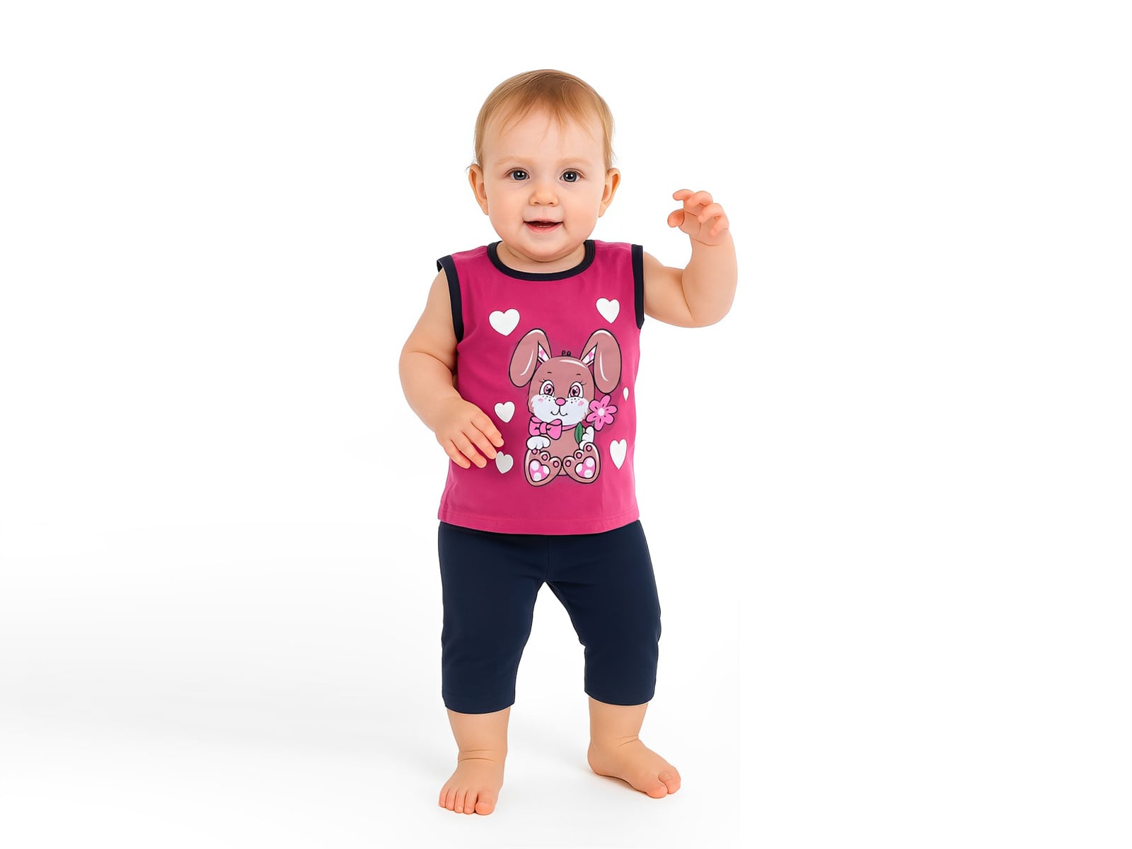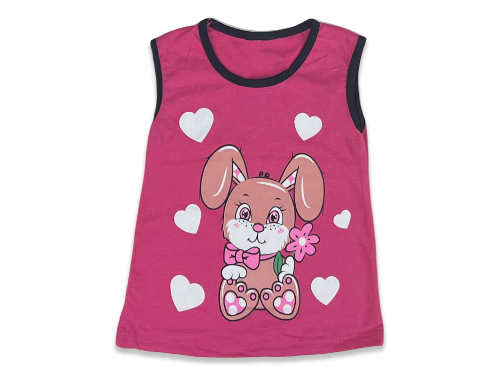 Το σετ αυτό αποτελείται από μια αμάνικη μπλουζίτσα και ένα παντελονάκι. Η μπλουζίτσα είναι σε φούξια χρώμα και έχει σχέδιο στάμπα λαγουδάκι και καρδούλες. Το παντελόνι είναι σε σκούρο μπλε χρώμα και έχει λάστιχο περιμετρικά στη μέση.