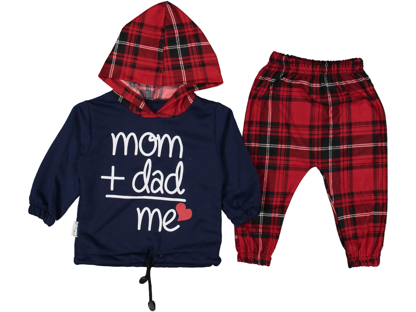 Το σετάκι αποτελείται από μπλούζα και παντελόνι από λεπτό ύφασμα. Η μπλουζίτσα είναι μακρυμάνικη σε σκούρο μπλε χρώμα με καρό κουκούλα και έχει στάμπα που γράφει “Mom + Dad = Me”. Το παντελονάκι είναι καρό χρώμα και έχει λάστιχο περιμετρικά στη μέση και στους αστραγάλους.