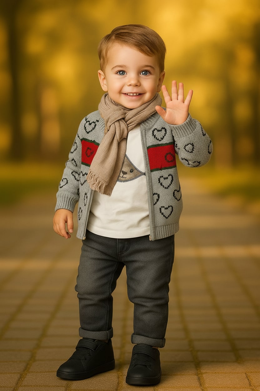 Παιδικό ολοκληρωμένο σετάκι το οποίο θα προσδώσει στυλ στο αγοράκι σας. Η μπλούζα είναι σε άσπρο χρώμα με σχέδιο στάμπα αρκουδάκι και τρουκς (κόπιτσες) στο πάνω μέρος. Η ζακέτα είναι πλεκτή σε γκρι χρώμα με κόκκινη λεπτομέρεια και έχει άνοιγμα με φερμουάρ. Το φουλάρι είναι σε μπεζ χρώμα. Τέλος, το παντελόνι είναι τύπου τζιν σε γκρι χρώμα με τσεπούλες στο μπροστινό μέρος, άνοιγμα με κουμπάκι και θυλάκια για ζώνη.